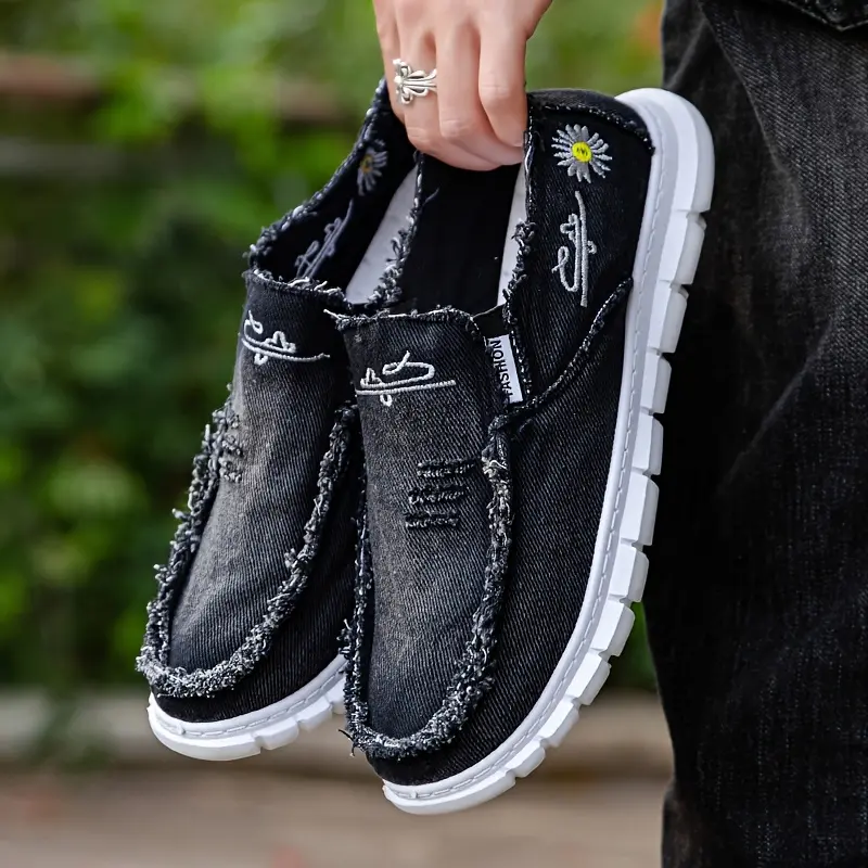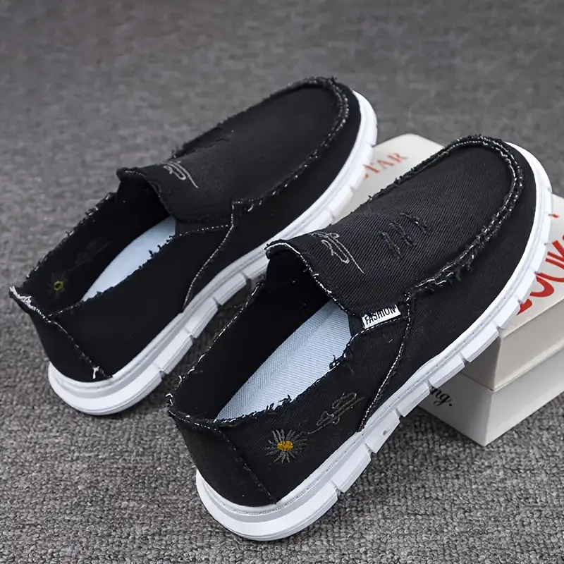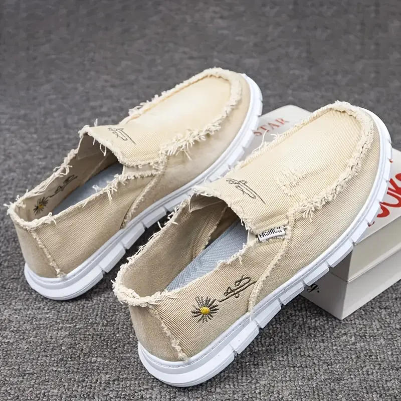 Women's Floral Daisy Embroidered Slip-On Loafers - Lightweight Washed Canvas with Anti-Slip PVC Sole, Frayed Trim Comfortable Sneakers for All-Season Casual, Party & Outdoor Wear, Ladies Shoes