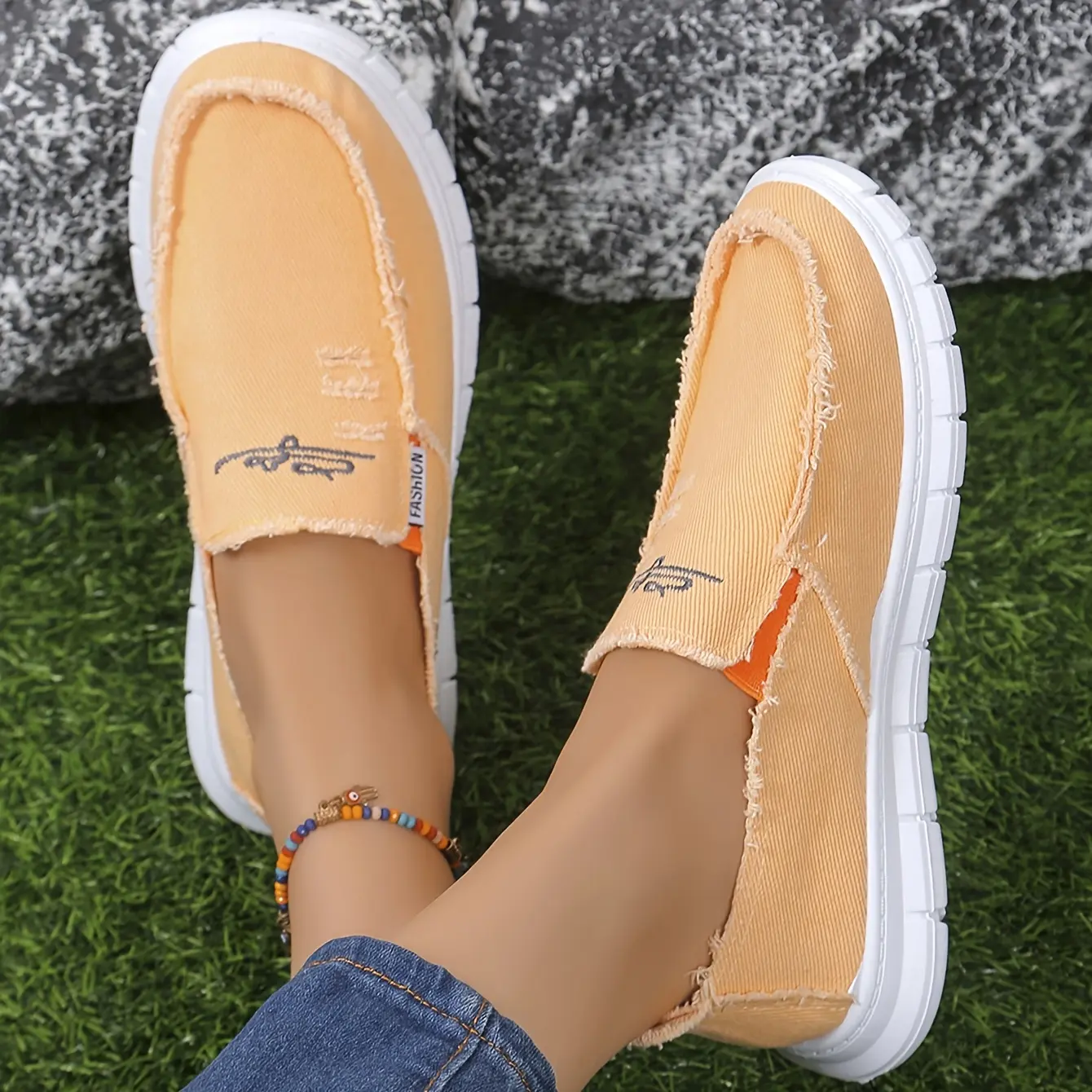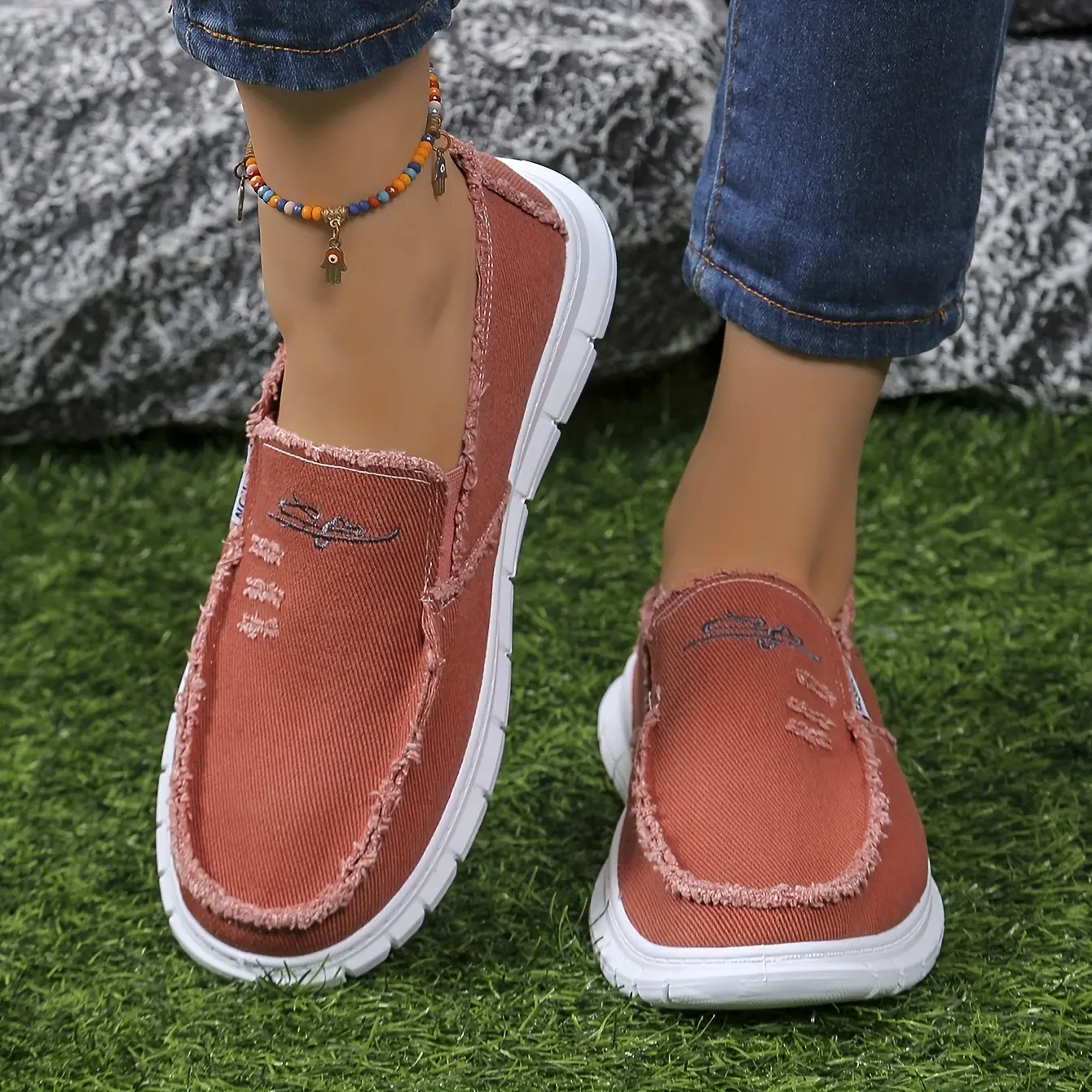 Loafers Floral Lettering Soft Sole Anti-Slip Durable Walking Flats Washed Canvas Casual Shoes Frayed Trim Comfortable Sneakers For Party Daily Outdoor Wear