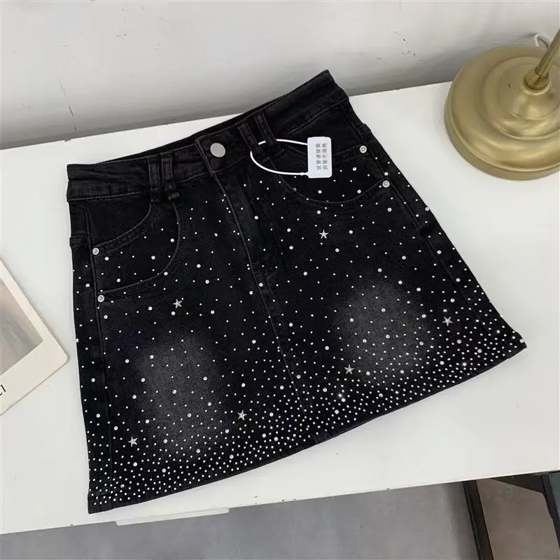Rhinestone Denim Skirt for Women 2025 Summer New Retro Slimming a-Line Sheath Denim Skirt Womenswear Bottom Fit Bodysuit Vintage Adjustable