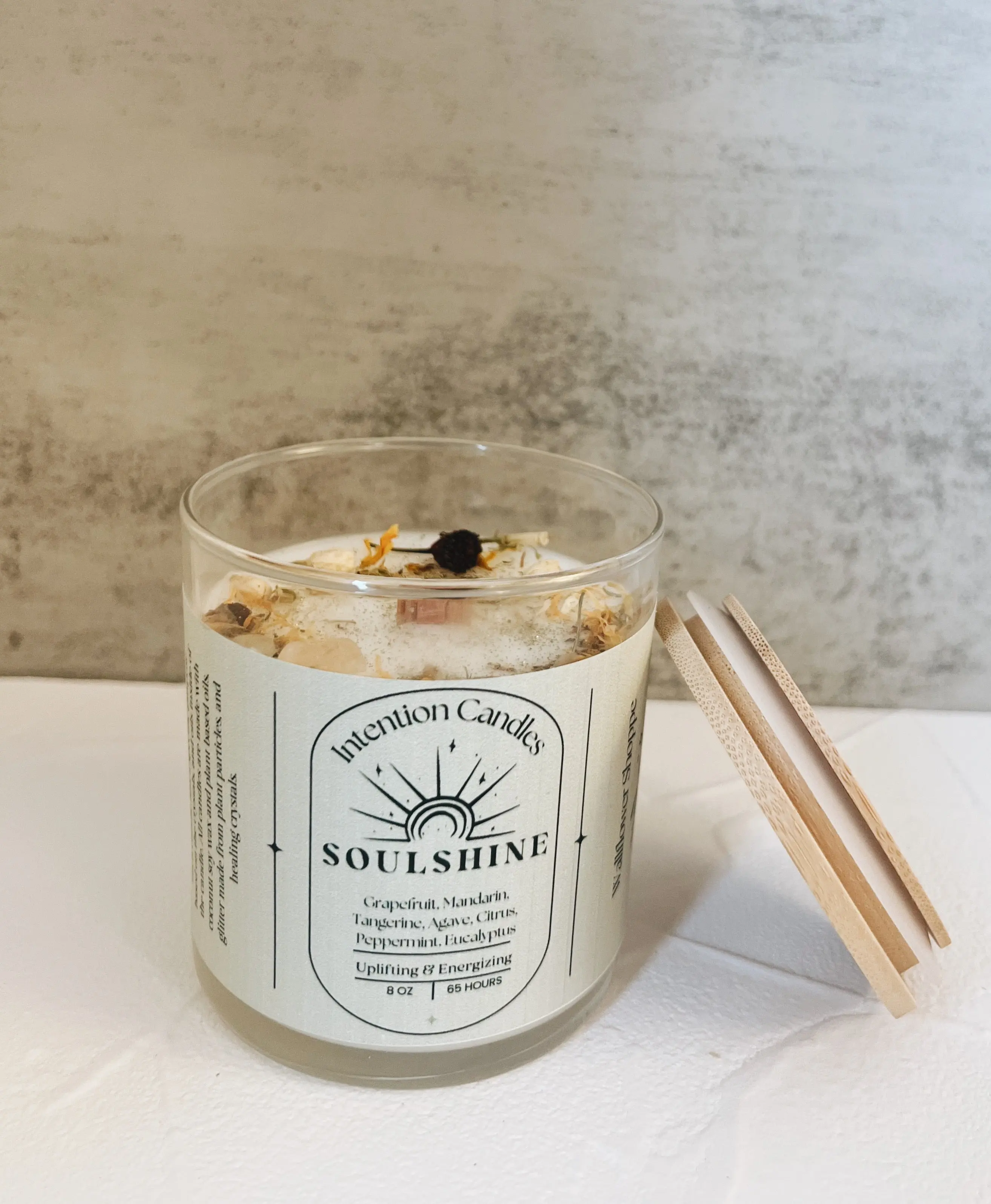 9oz glass jar with biodegradable glitter and crystals. Each candle is unique and different.