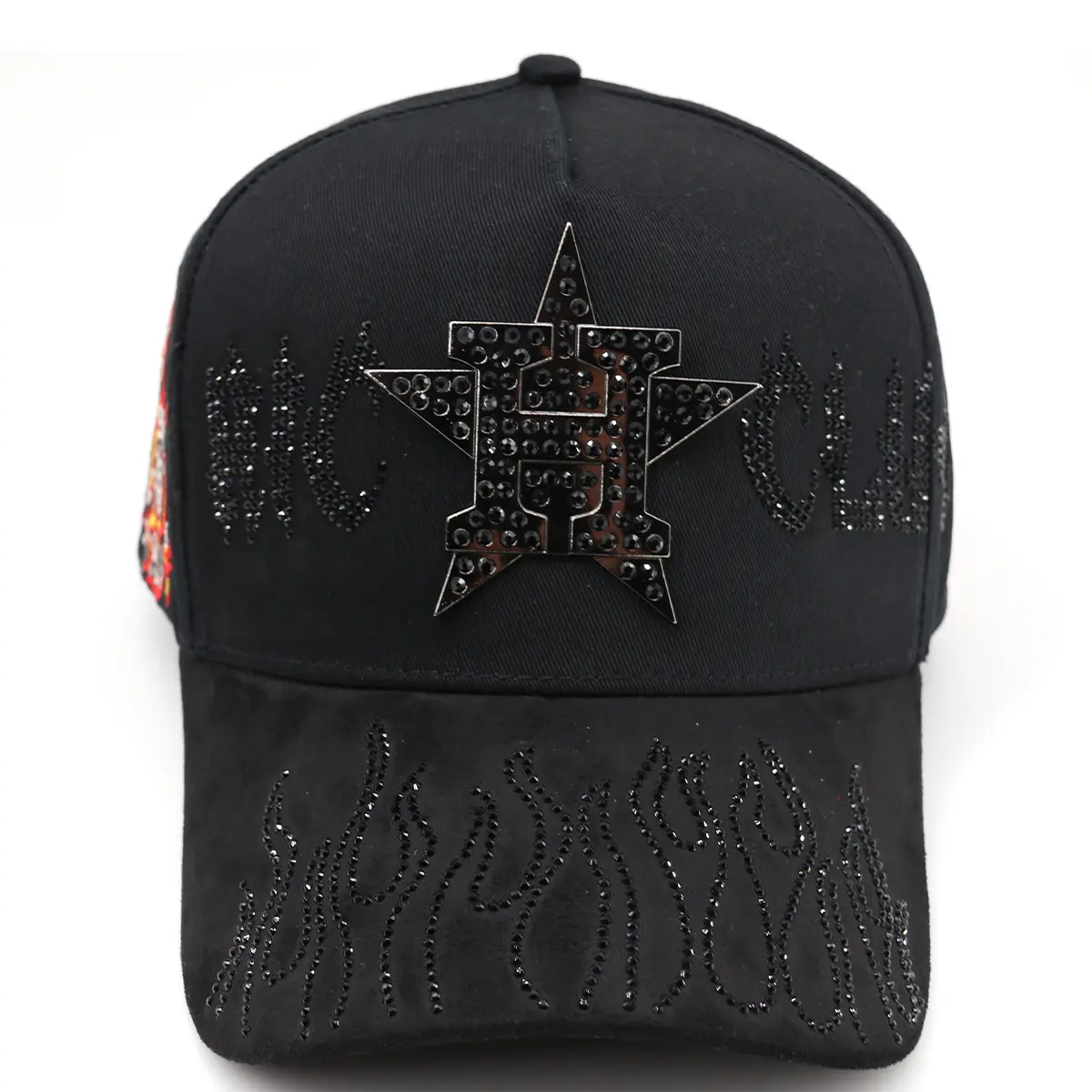 ·Black Embroidered Design: Features a striking flaming skeleton rhinestone motif.