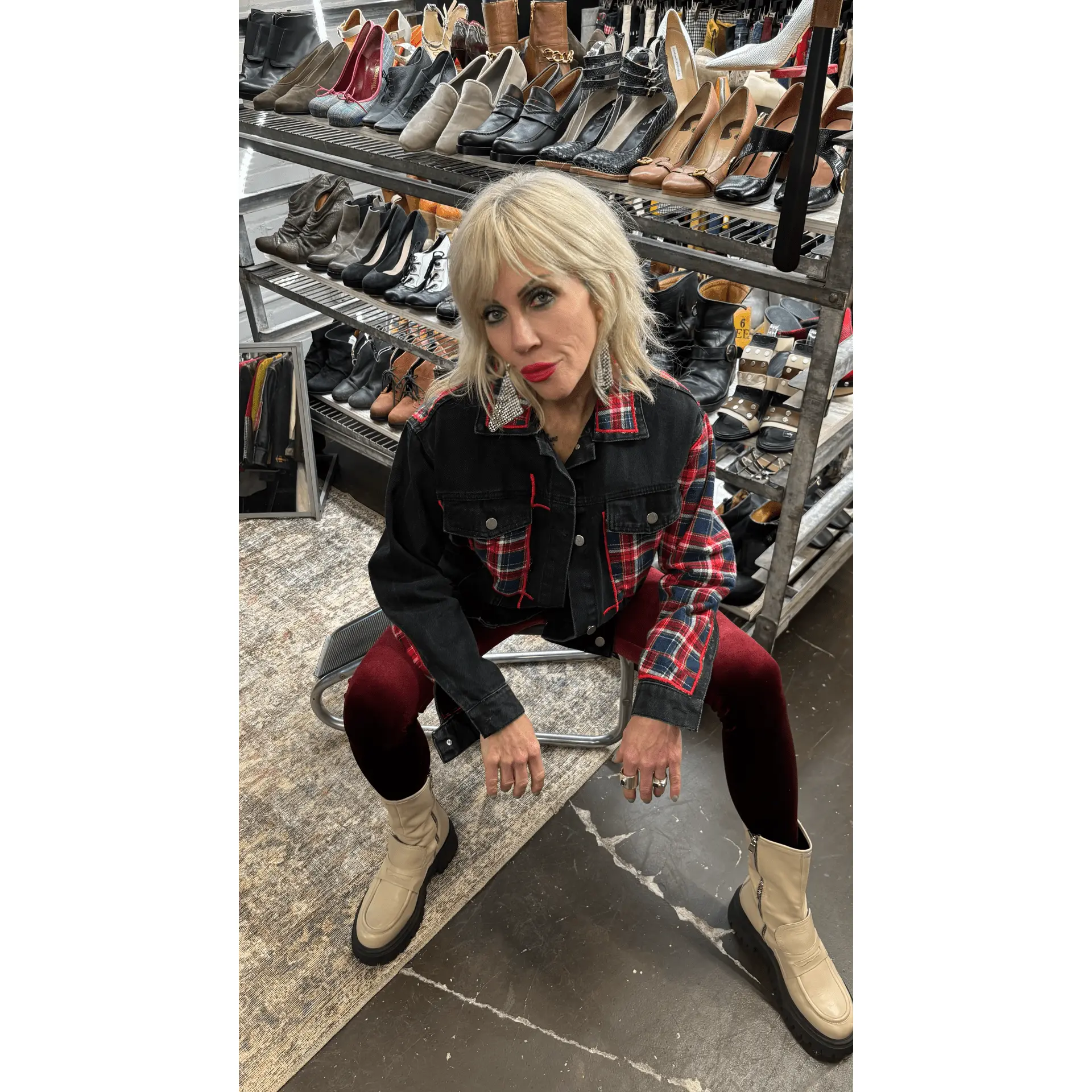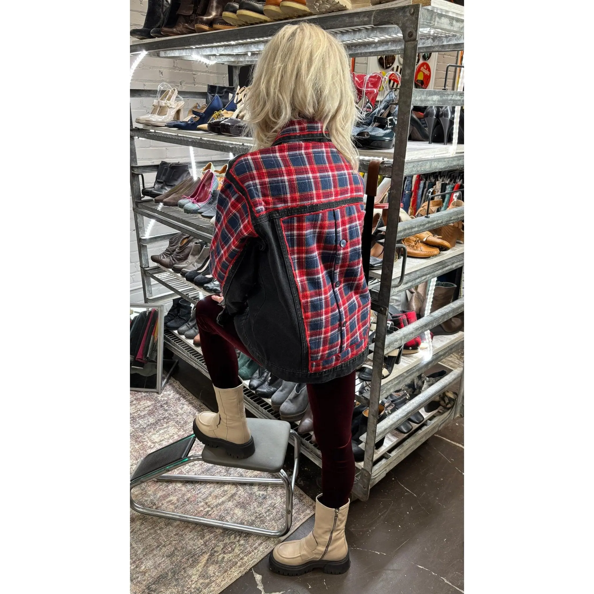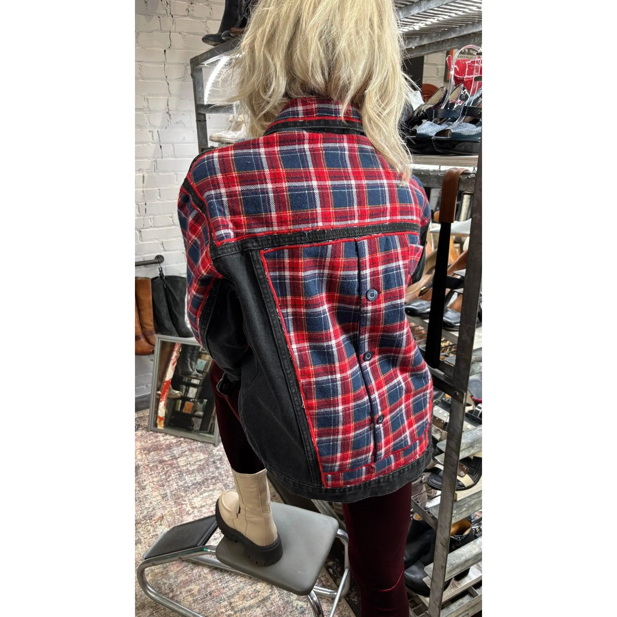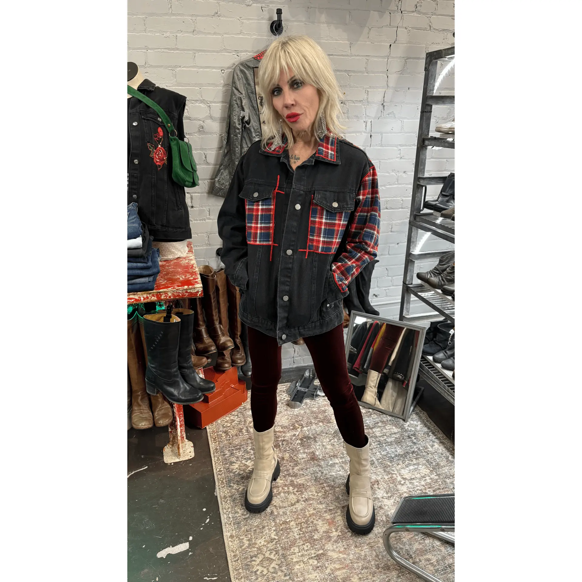 Workwear base, punk upgrade. one-of-a-kind denim jacket reworked with red flannel contrast and statement detailing.