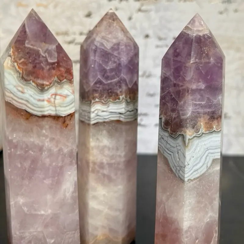 Amethyst Lace Agate is a beautiful banded variety of quartz, primarily from Mexico (Durango) and South America, featuring lovely lavender/purple hues from amethyst mixed with white, pink, or peach lacy patterns from Crazy Lace Agate, known for supporting joy, grounding, spiritual growth, and inner peace in crystal healing. It's popular for jewelry and decor, prized for its intricate bands, druzy pockets, and ability to take a great polish.