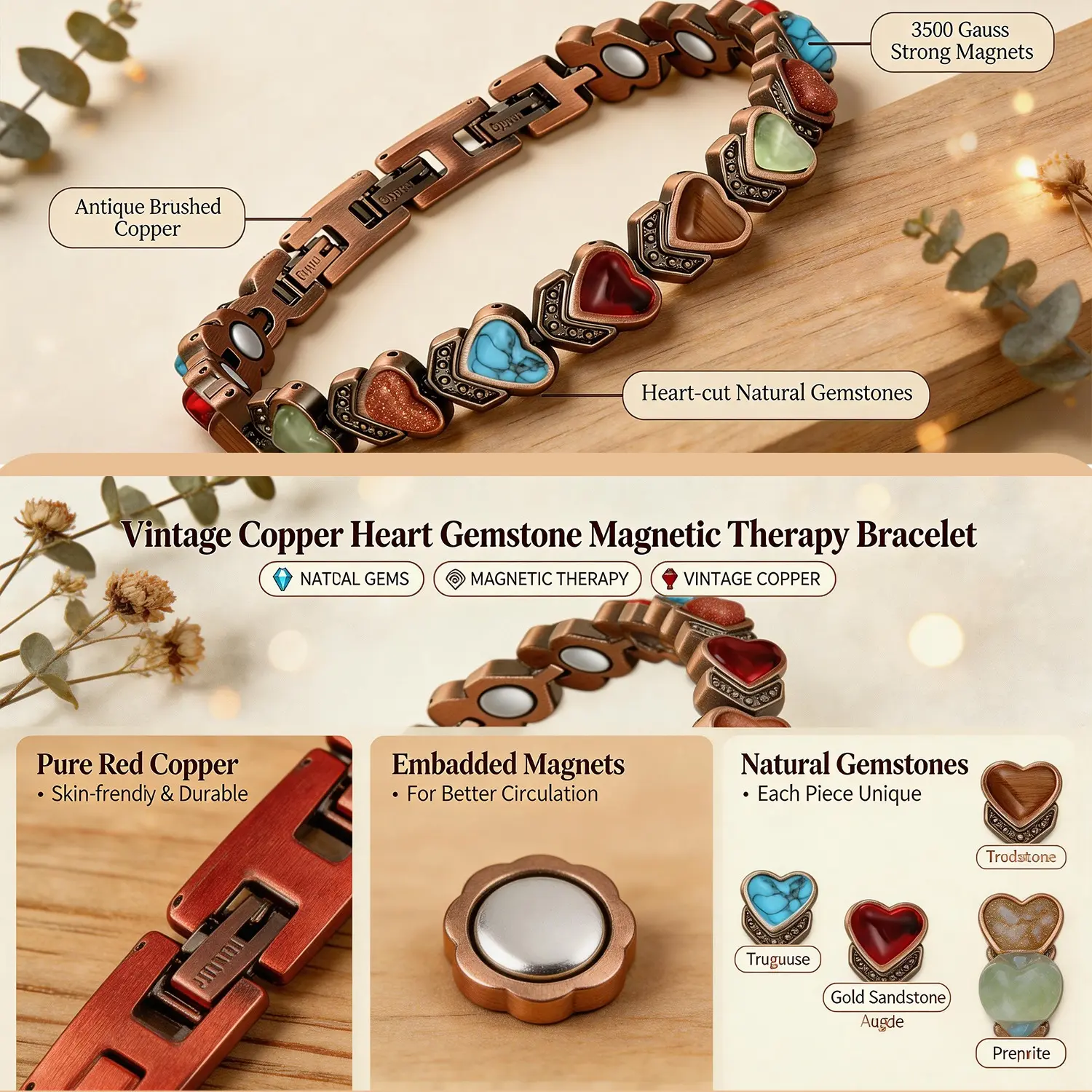 The vintage copper links are paired with multi-color natural gemstone hearts, each with its own unique texture and glow-like wearing a little piece of nature’s universe on your wrist. Built-in high-strength magnets provide gentle wrist relief throughout the day, making commuting, typing, and daily tasks feel noticeably more comfortable.