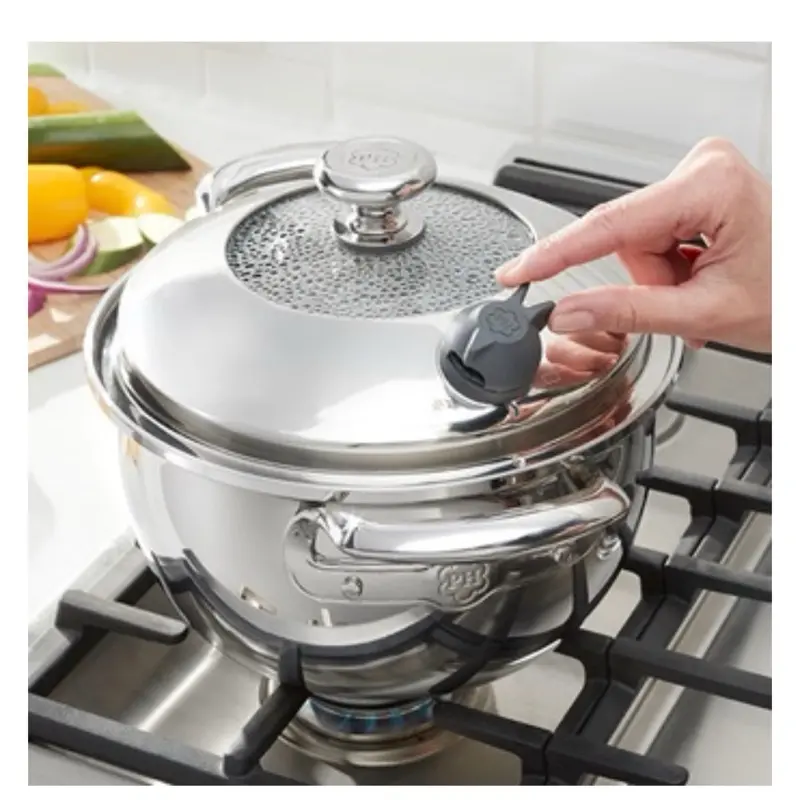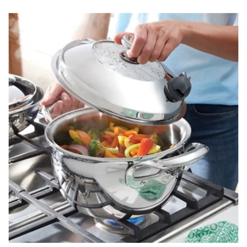 ·Los artículos de cocina de Acero Inoxidable 5-Ply Vida Sana® te ayudan a preparar platillos saludables y sabrosos con el giro de una válvula, con poca o nada de agua y sin grasa.