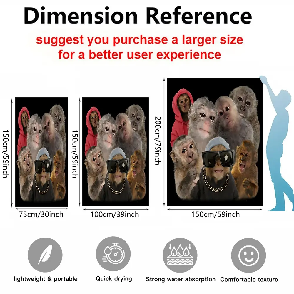 Trending Fun Monkey Adult Beach Towel, Trendy Cool Print Design, Lightweight Quick-Dry Towel, Suitable for Poolside, Vacation, Travel, and Outdoor Summer Use, Lightweight, Quick-Drying