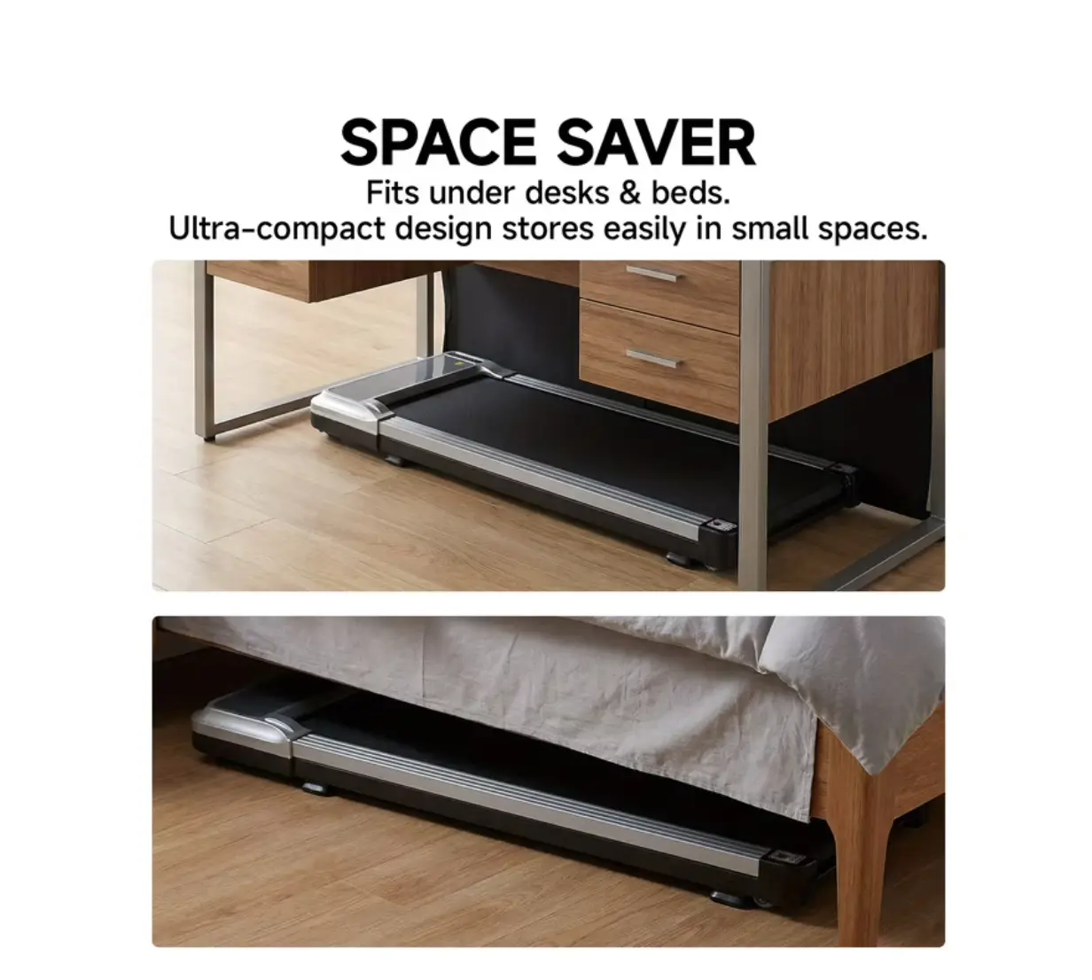 ·【Space-Saving & Portable Design】Measuring just 42.2" L x 19.2" W x 3.58" H and weighing 35 lbs, this treadmill fits seamlessly into compact spaces. Its ultra-thin profile allows for easy storage under furniture, making it perfect for apartments, offices, or dorm rooms. The built-in transport wheels enable effortless relocation, ensuring your workout area stays organized without compromising on functionality or floor space.