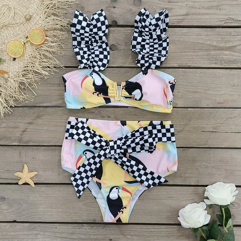 Printed lace up neck hanging sexy bikini triangle hot spring split swimsuit for women