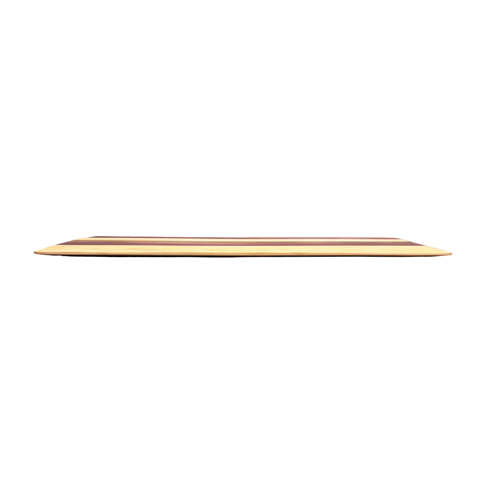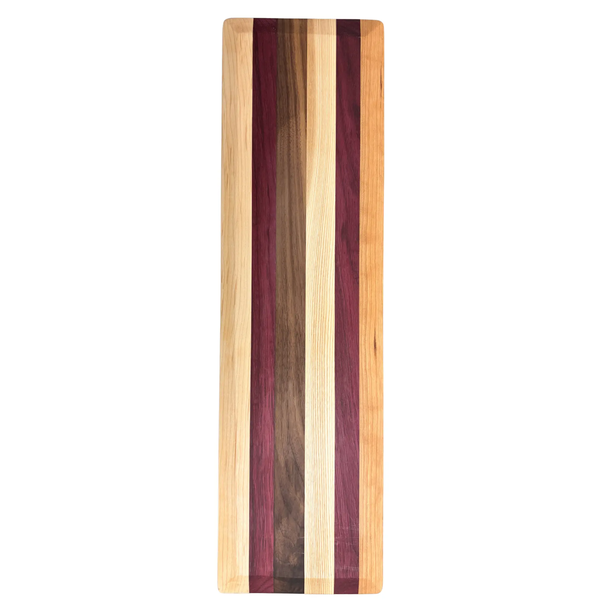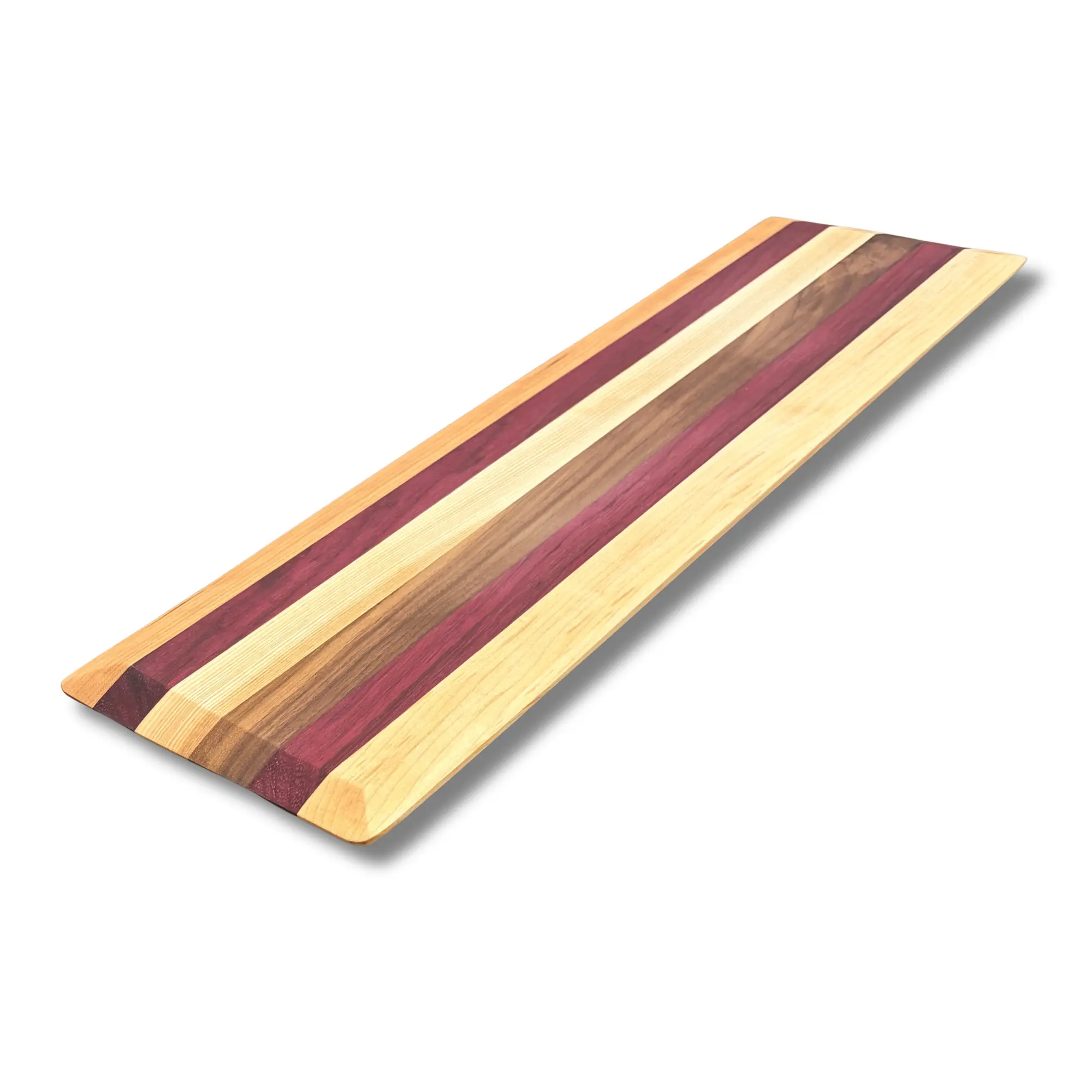 The Mytic Cheese Board is a sleek, elongated serving piece handcrafted from a striking blend of premium white ash, American cherry, rock maple, purpleheart, and black walnut. The combination of contrasting hardwoods creates a refined, eye-catching design that elevates any table setting.