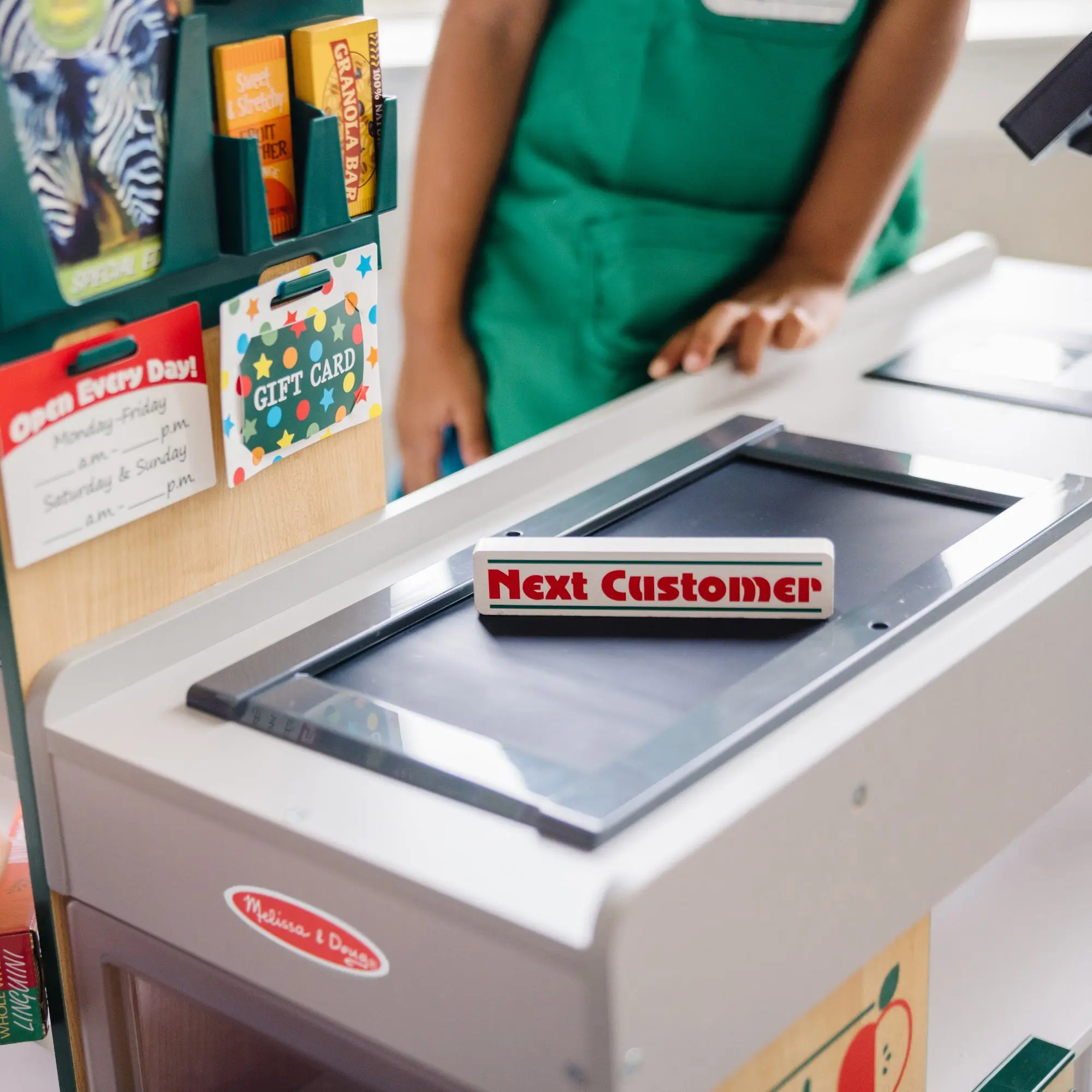 Shopping and playful purchasing is exciting at the sturdy wooden Fresh Mart Grocery Store! The free-standing play space with smooth, curved corners and edges lets customers three and older browse the shelves and pay for purchases on one side, and allows the grocer to ring up items on the other. Realistic features include beeping “scanner,” a hand-crank conveyor belt, a card-swiping machine, a keypad/calculator, and cash drawer. Styles and colors may vary. Kids are sure to find everything on their shopping list at this friendly neighborhood grocery store! This product is certified by the Forest Stewardship Council. FSC certification ensures that products come from responsibly managed forests that provide environmental, social, and economic benefits, and that forests are protected for future generations. Please note that FSC certification applies to new inventory only (FSC C156584)