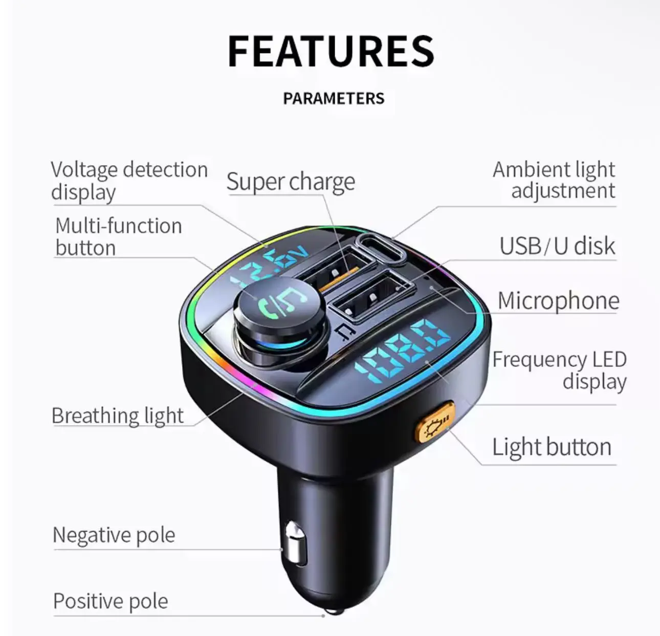 Full-frequency FM wireless transmission technology, which can directly read audio files on Bluetooth mobile phones/U disks.