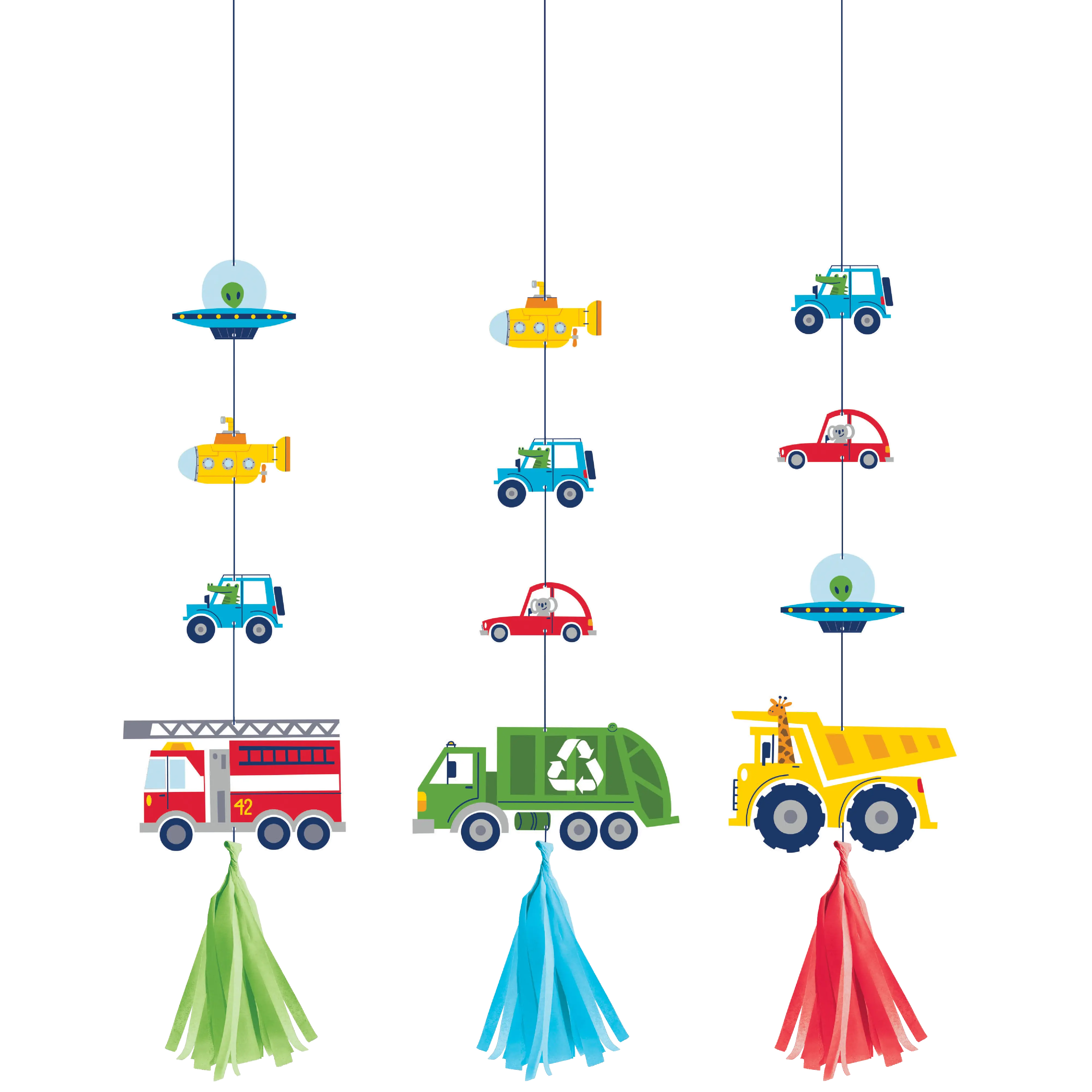 Designed with fun details like fire trucks, dump trucks, cars, and even a few unexpected extras, each strand adds movement and dimension above your table, dessert area, or entryway. The layered look of vehicles paired with bold tassels makes this set perfect for tying your whole party setup together.