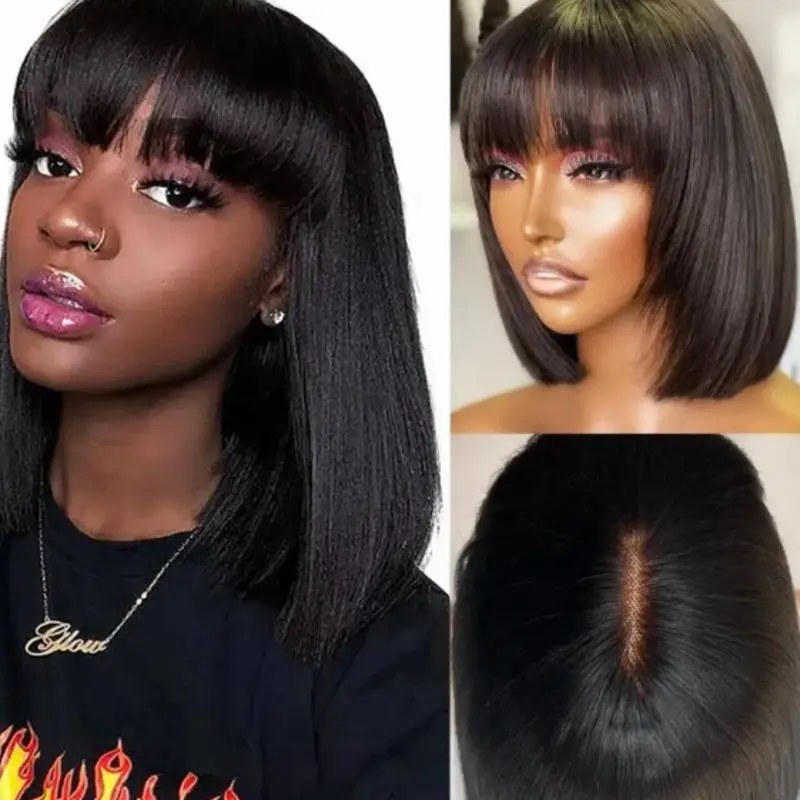 Put On And Go Reddish Purple Layered Cut Yaki Straight Minimalist Lace Bob Wig With Bangs 100% Human Hair