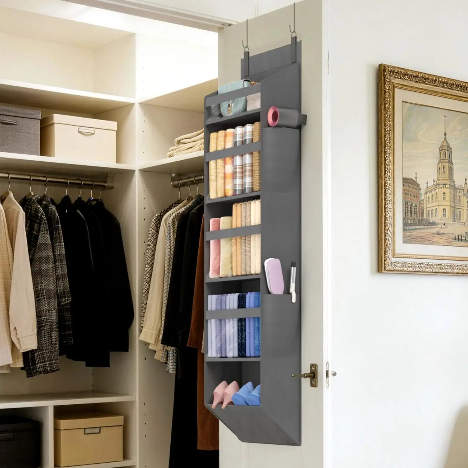 1 Pack Over the Door Organizer, Clear Window Hanging Storage with 4 Side Pockets, Anti Tilt 40 lbs Load Behind Door for Pantry, Nursery, Bathroom, Bedroom, Dorm, 5 Section, Gray