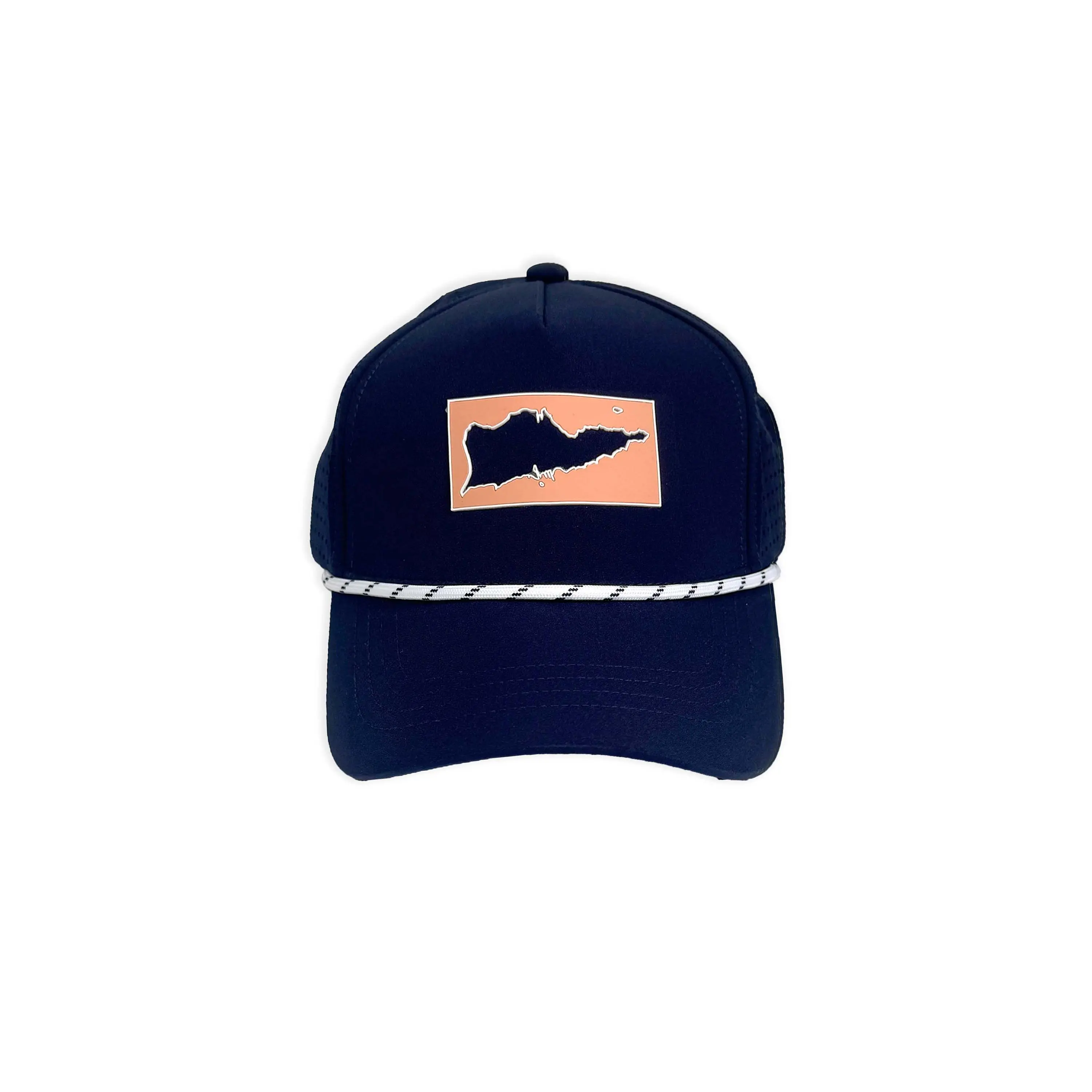 We love to represent our island. Why not put it on the front of a hat in a cooling performance material? This hat is perfect for any sport. It features a navy color with a distinctive island patch.