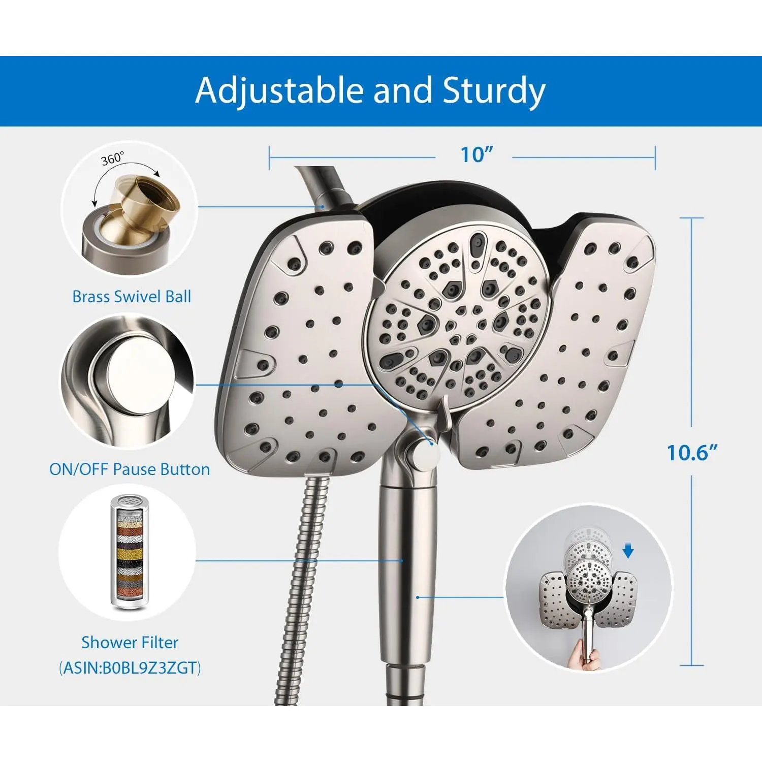 Shower Head with Handheld High Pressure: 10" Rainfall Shower Head & Shower Head, 9 Spray Settings Detachable Shower Head with Switch and 15-Stage Filter