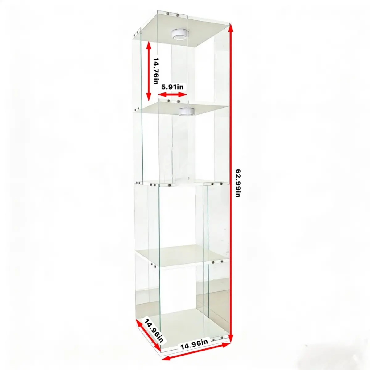 ·Tempered Glass Display Cabinet: Measures63.19" (H) x14.96" (L) x14.96" (W), with an overall weight capacity of 110 lbs, each tempered glass shelf can hold up to 11lbs, Color: white