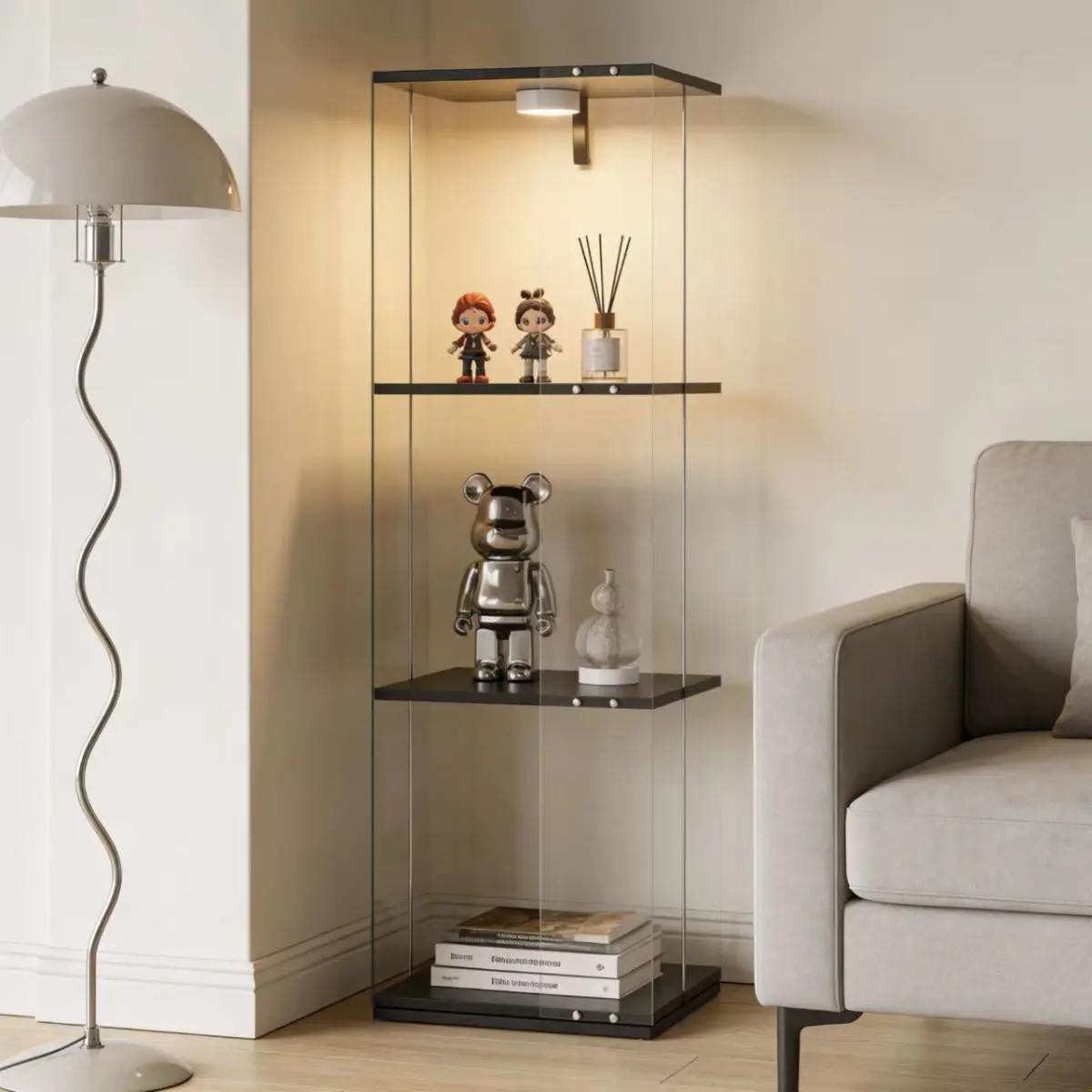 ·This tempered glass cabinet is equipped with battery-powered PAIPAI lights that can be controlled by a remote control. It can change into a variety of colors according to your needs. The lighting setting adds a mysterious and romantic atmosphere to this cabinet.