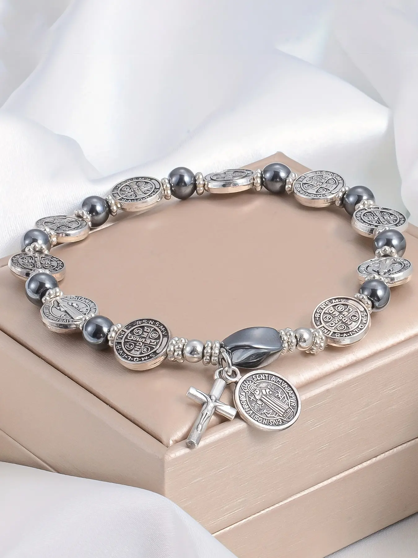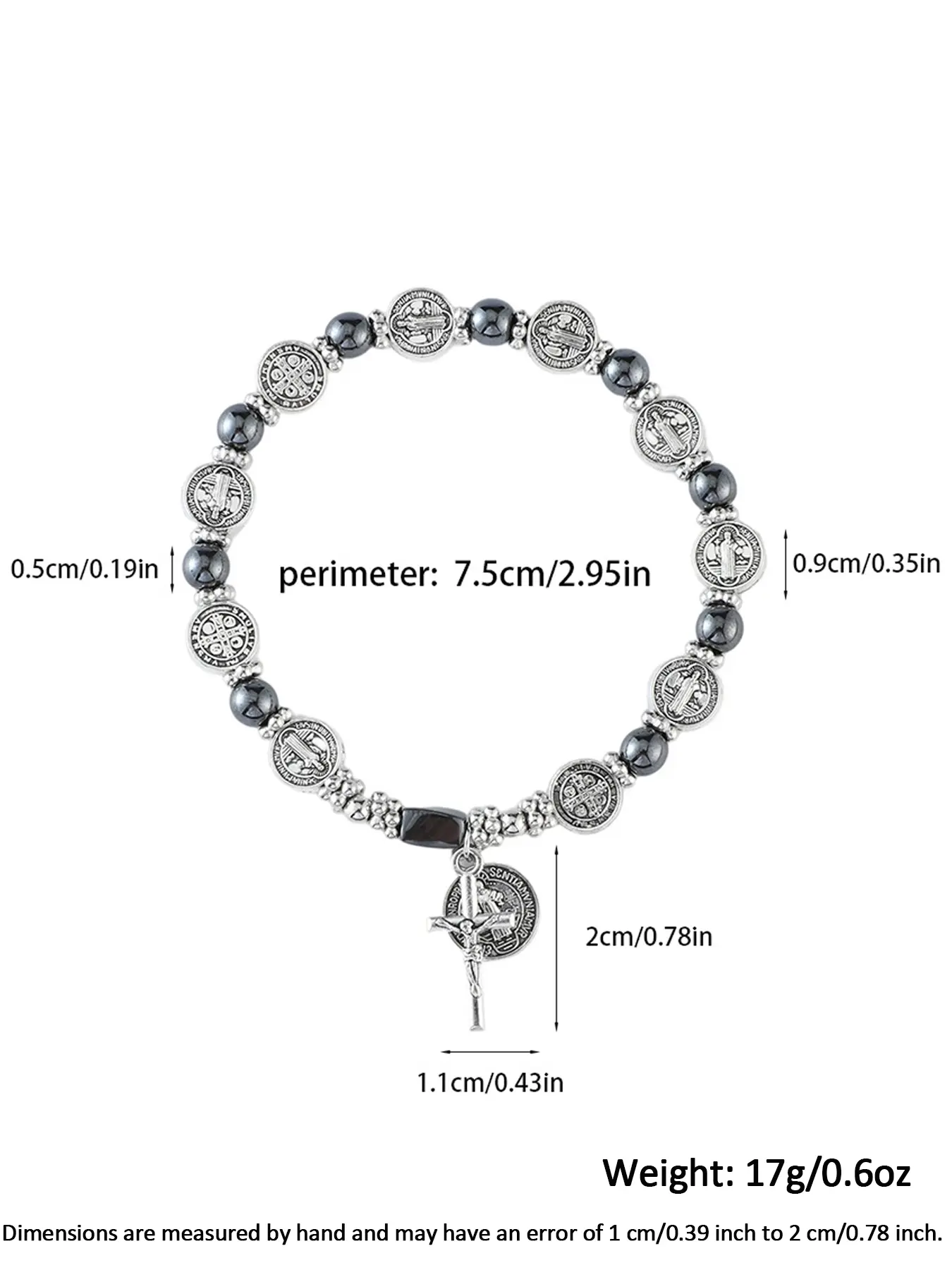 Vintage Agate Beaded Bracelet, Handmade Elastic String, Fashion Casual Unisex Jewelry, Cross Pendant Charm