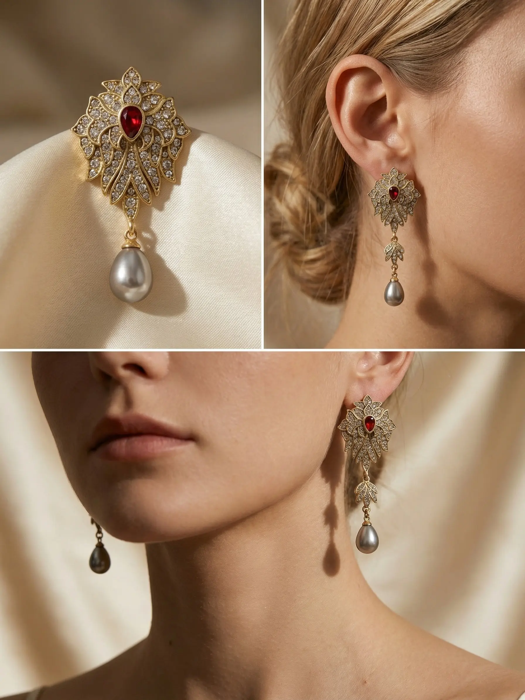 Vintage copper alloy rhinestone red rhinestone flower glass pearl pendant earrings