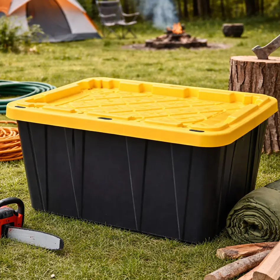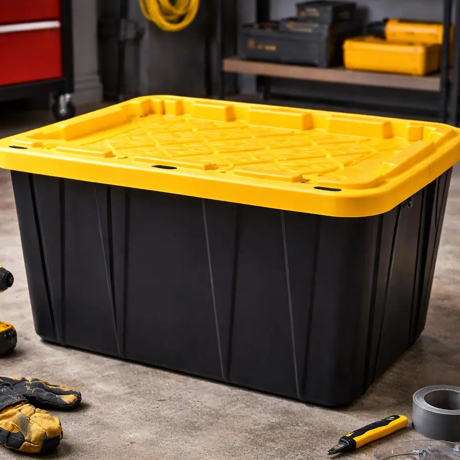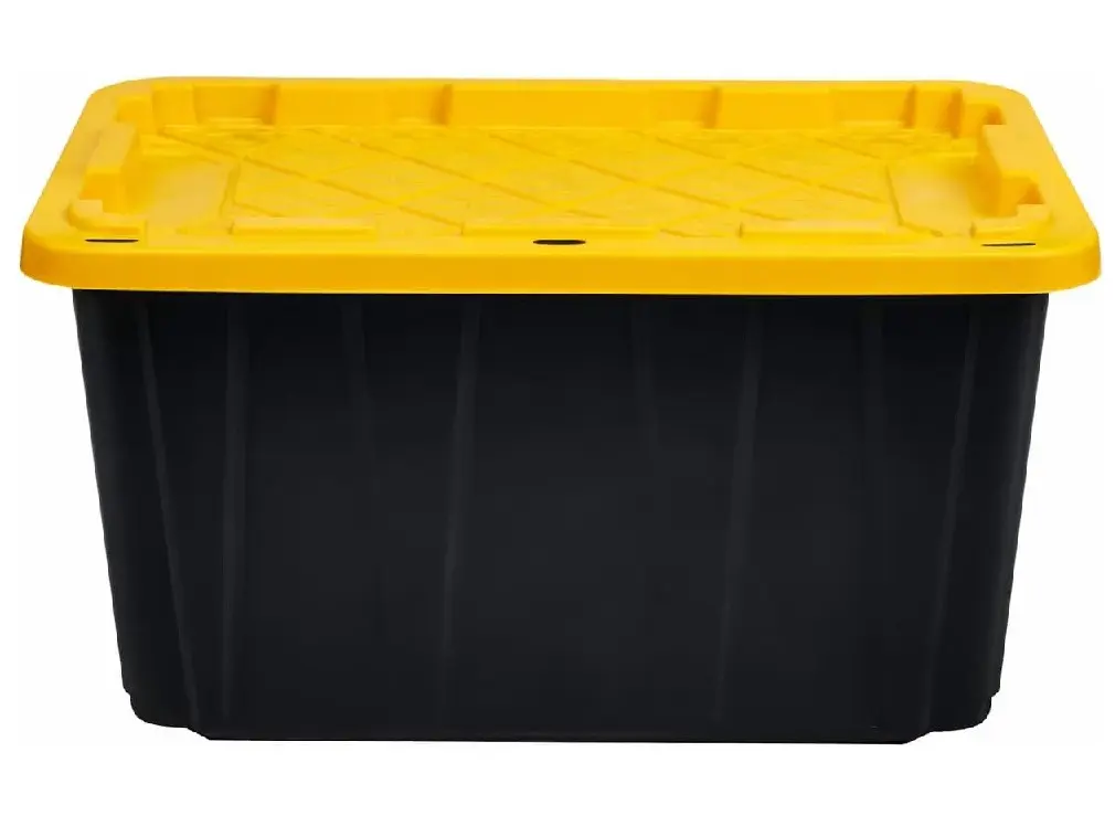 27 Gallon Heavy-Duty Black & Yellow Storage Tote | Durable Stackable Organizer for Home, Garage & Travel