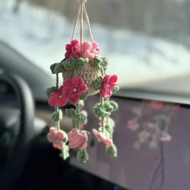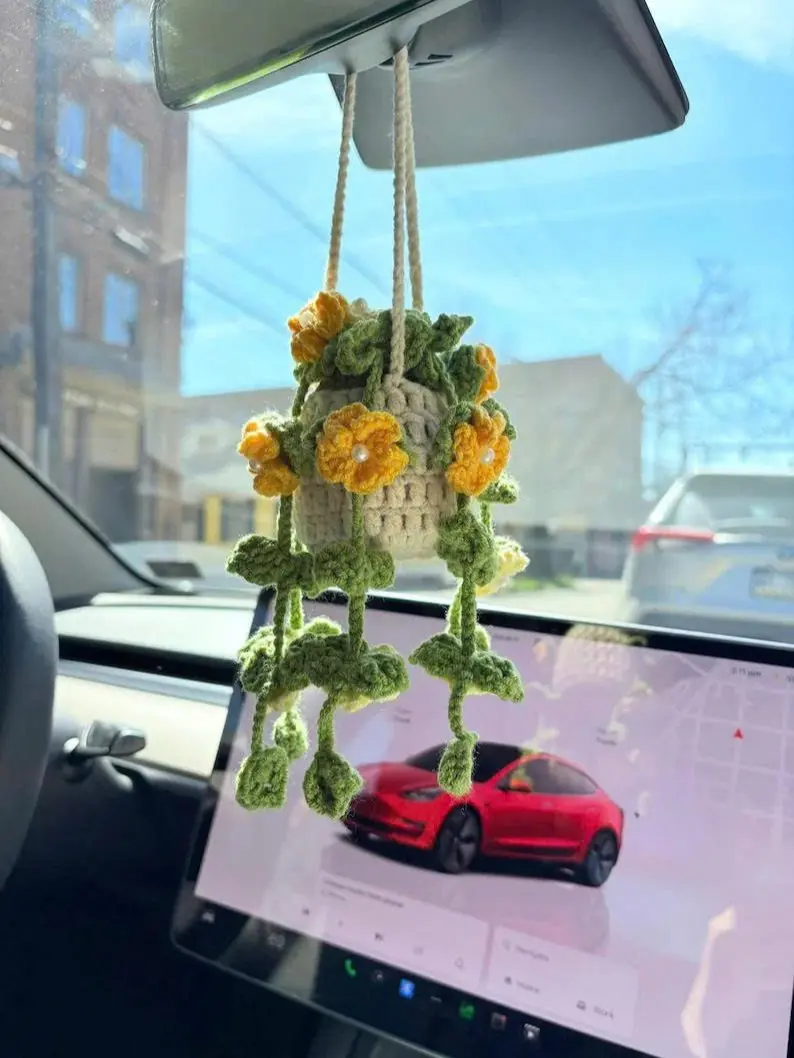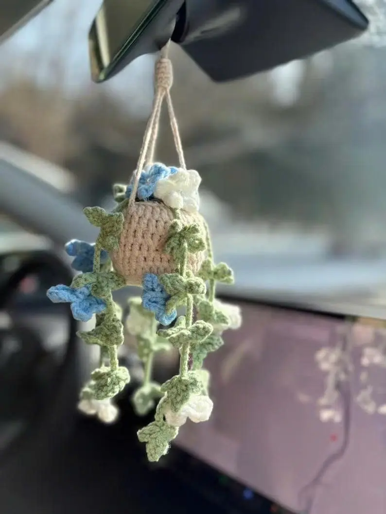 Bring a touch of greenery on the go with this adorable crochet hanging plant, designed to add charm and personality to your car! This handcrafted mini plant dangles perfectly from your rearview mirror, giving your vehicle a cozy and stylish vibe—no watering required!