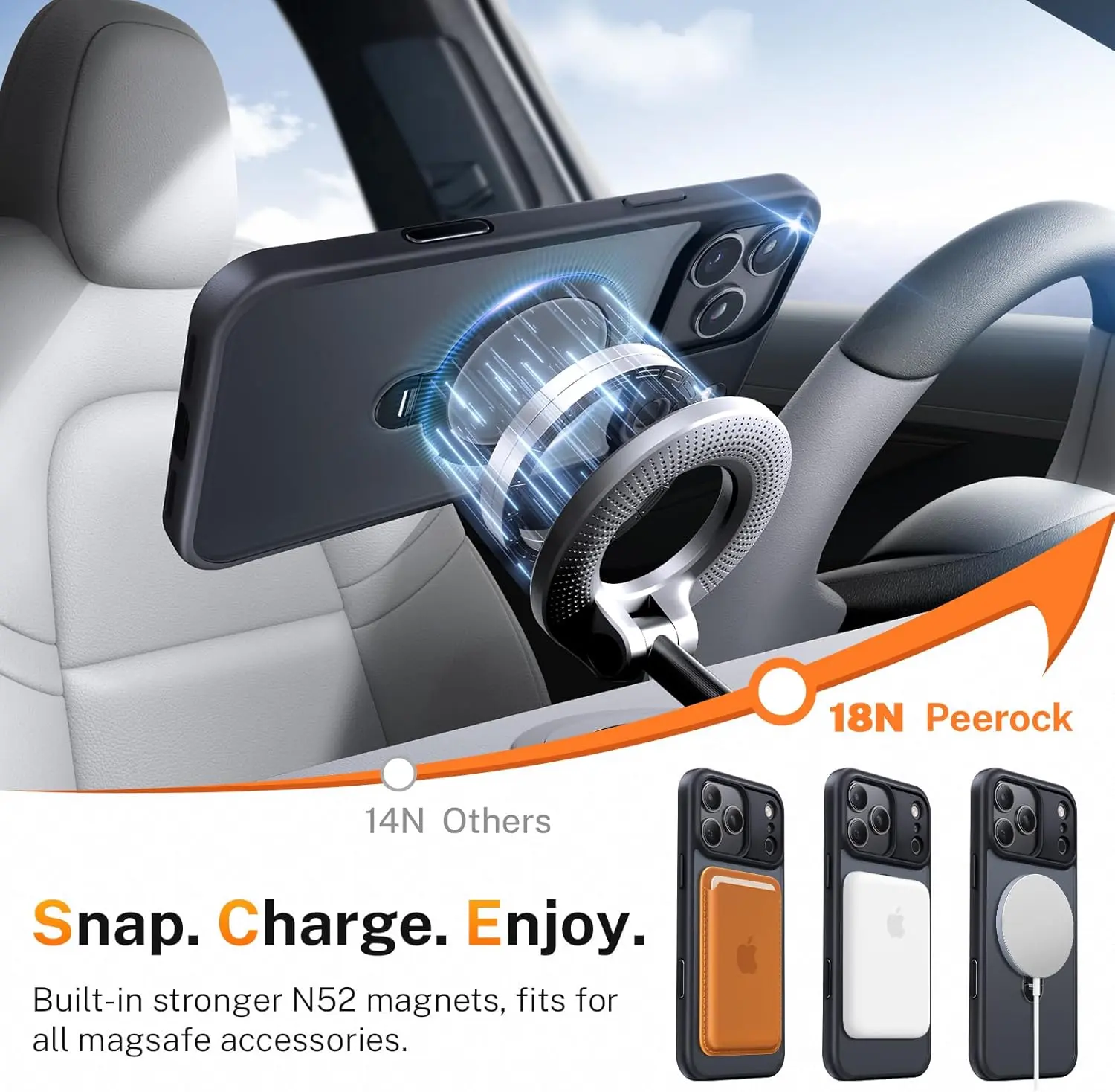 This ring stand case is embedded with powerful N52 magnets that align perfectly with your iPhone. It snaps securely onto car mounts, wallets, power banks, and more, enabling easy attachment and safe wireless charging. The ring has a smooth, polished finish with rounded edges to avoid scratching your hands or MagSafe accessories.Note: Fully compatible with official MagSafe accessories and most third-party wireless chargers.
