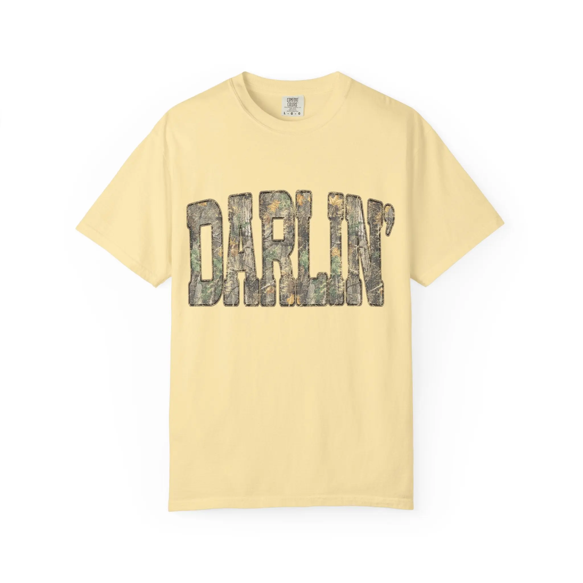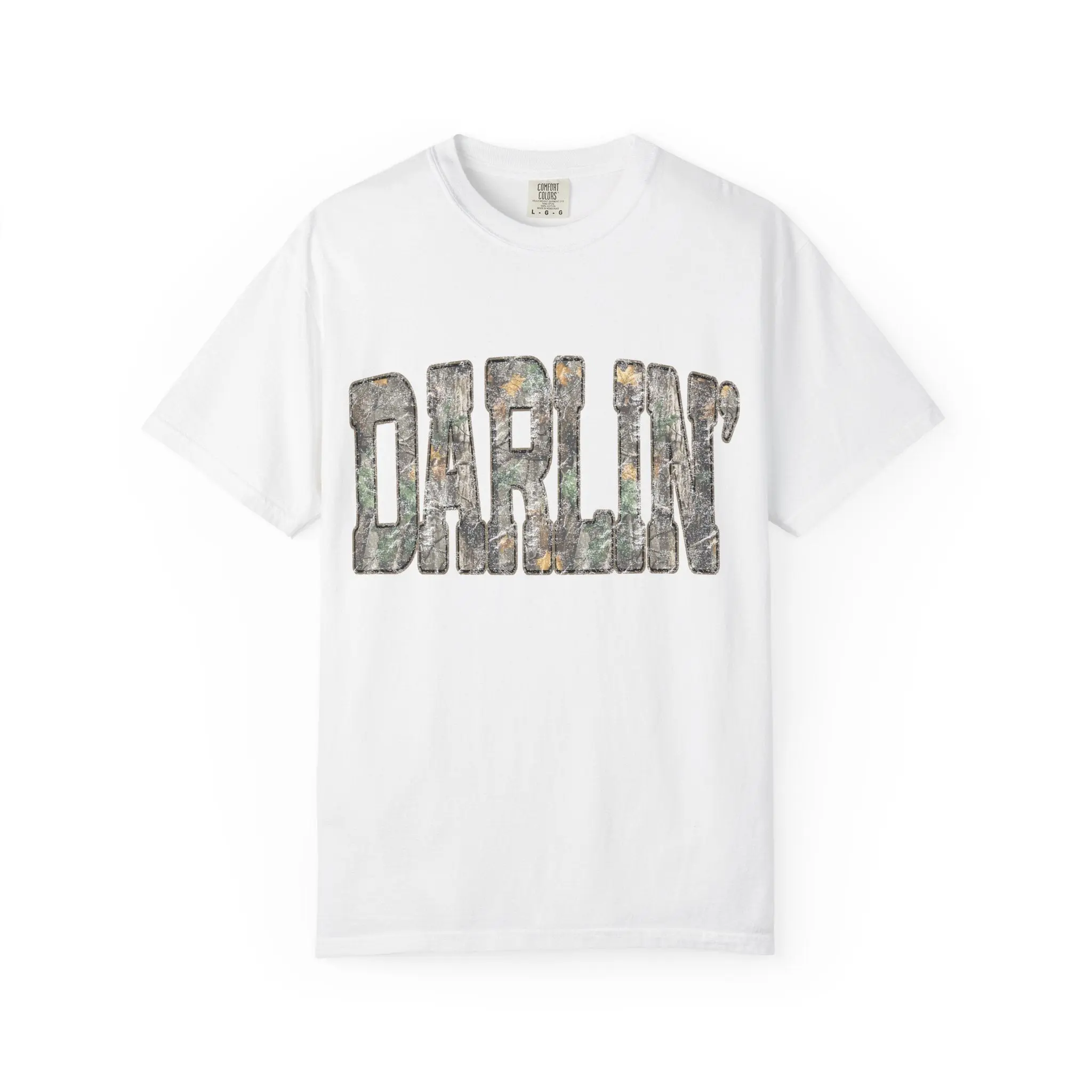 A relaxed, garment-dyed tee that reads like a warm hello. Heavyweight, soft-washed cotton gives this shirt a lived-in feel from the first wear. The front features bold, textured lettering that spells out “DARLIN’” in a weathered, nature-inspired print — subtle and a little rugged. It layers effortlessly over a long-sleeve in cool months or stands on its own in summer. Wear it to slow coffee mornings, porch nights, or weekend drives when you want something comfortable that still says something personal.