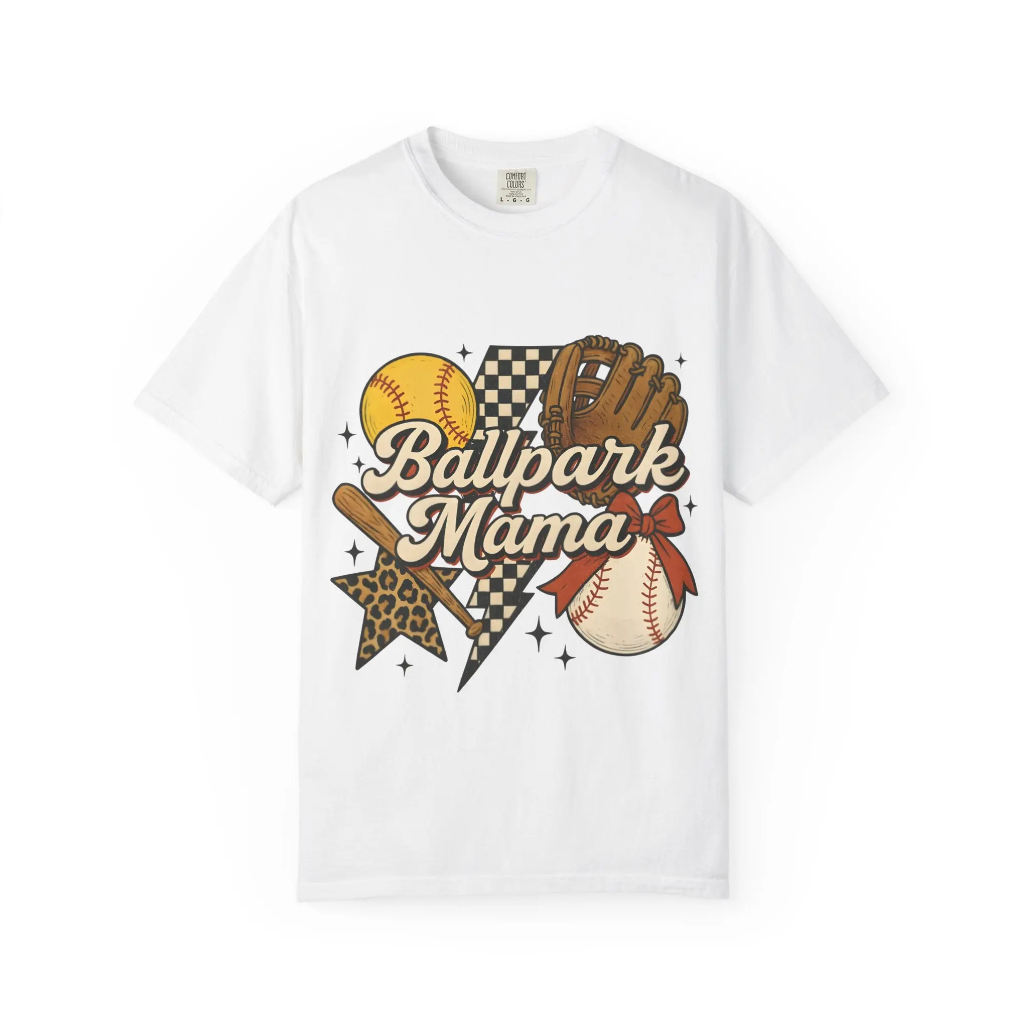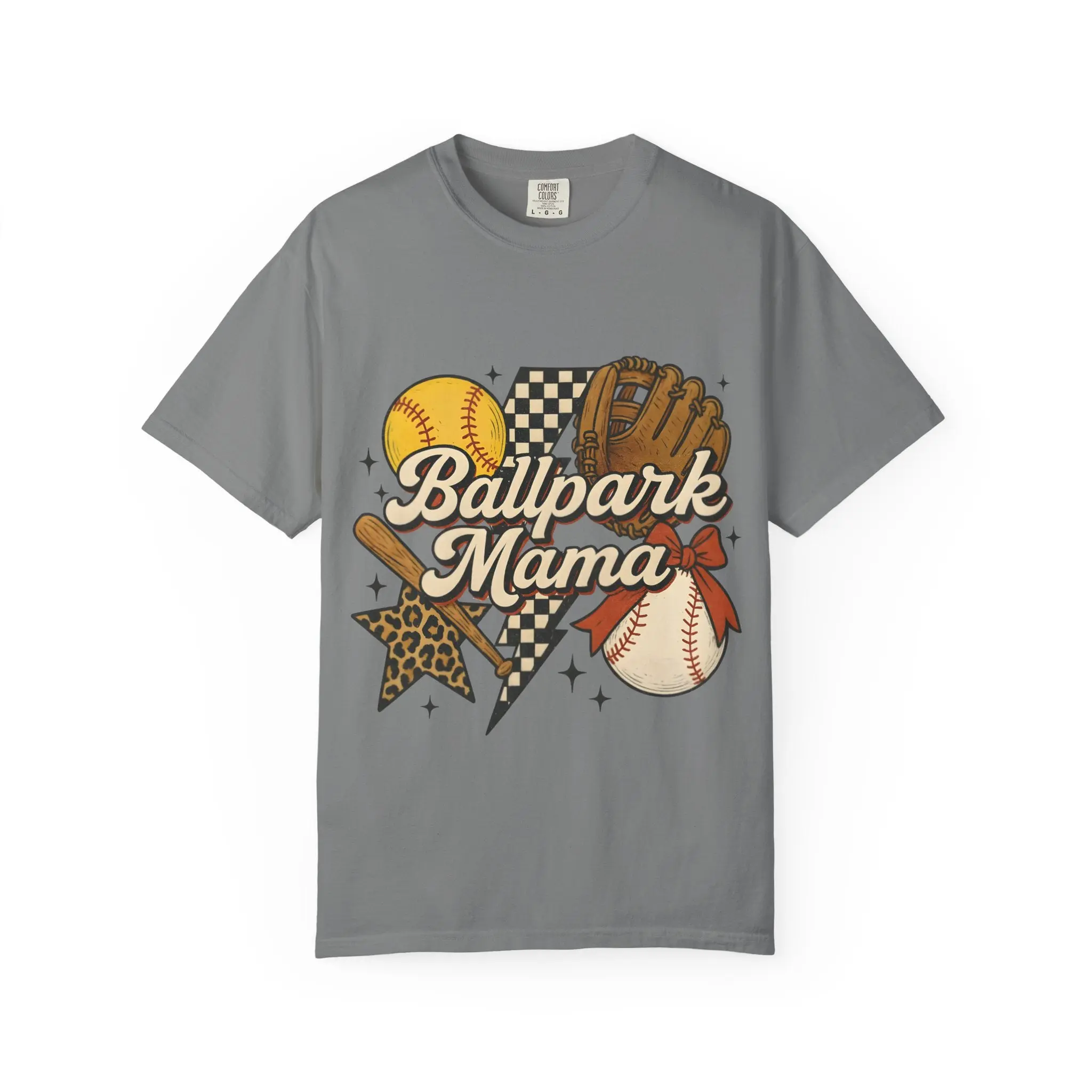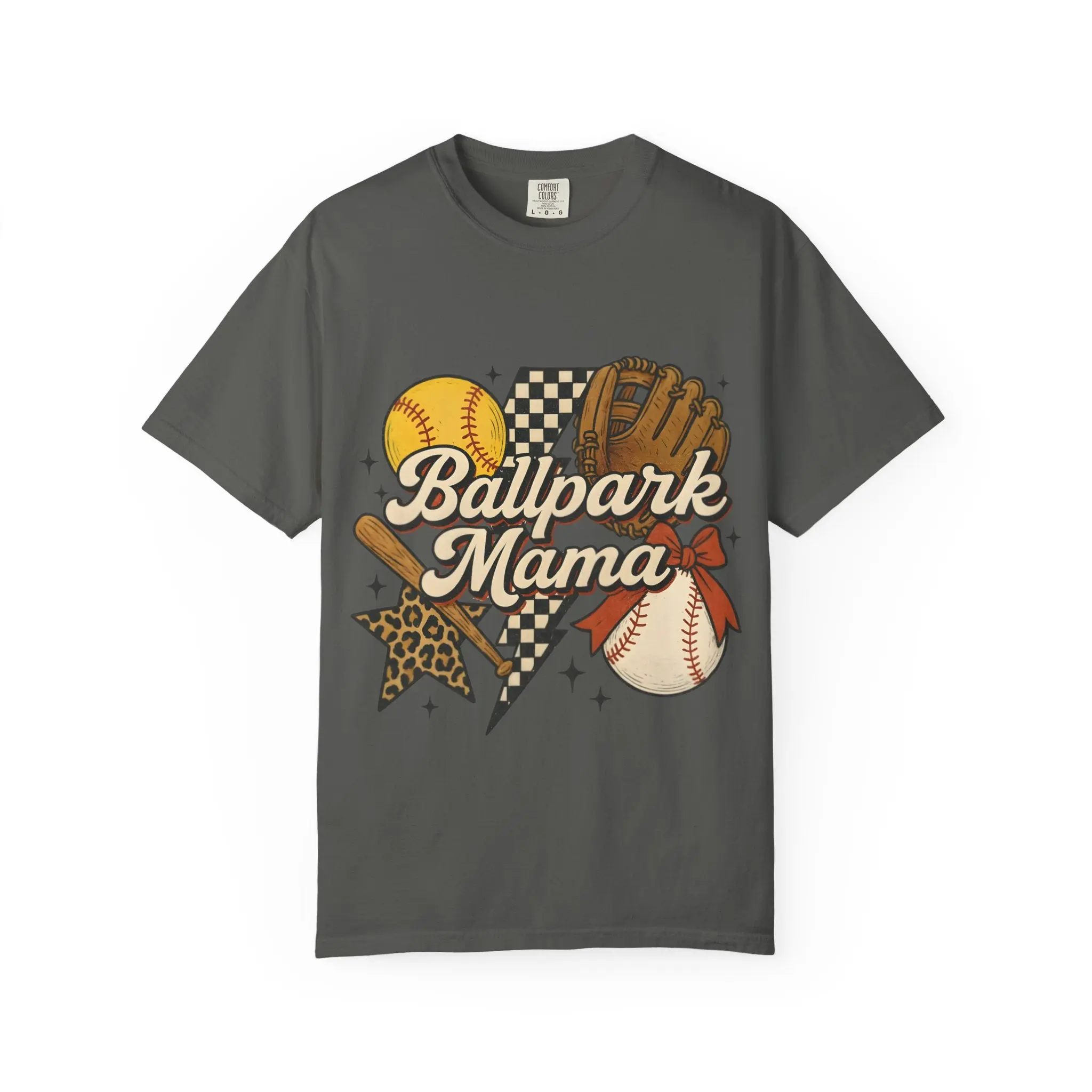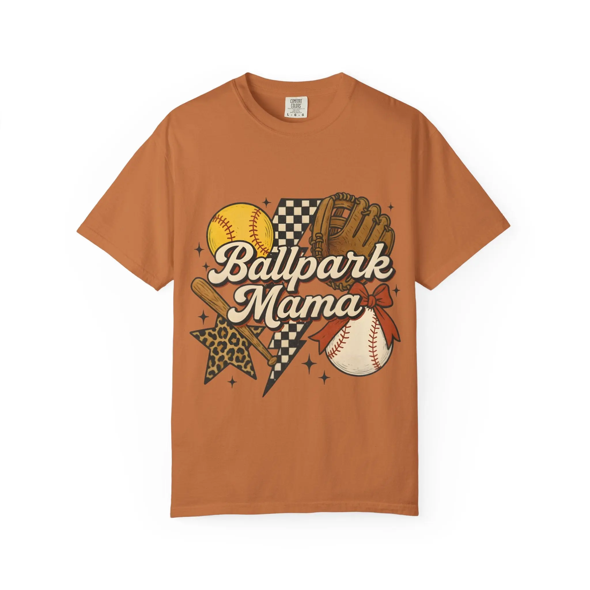 Soft, lived-in tee made to carry the easy energy of a ballpark afternoon. The heavyweight, garment-dyed cotton feels broken-in from the first wear, while the relaxed cut lets you move freely. A retro-style graphic—softballs, a glove, bat and a playful “Ballpark Mama” script—adds nostalgic charm with subtle pattern accents. Wear it to warm up in the stands, run last-minute errands after practice, or layer under a flannel for cooler evenings. It reads like a mom who knows the lineup, remembers every schedule change, and still has time to cheer the loudest.