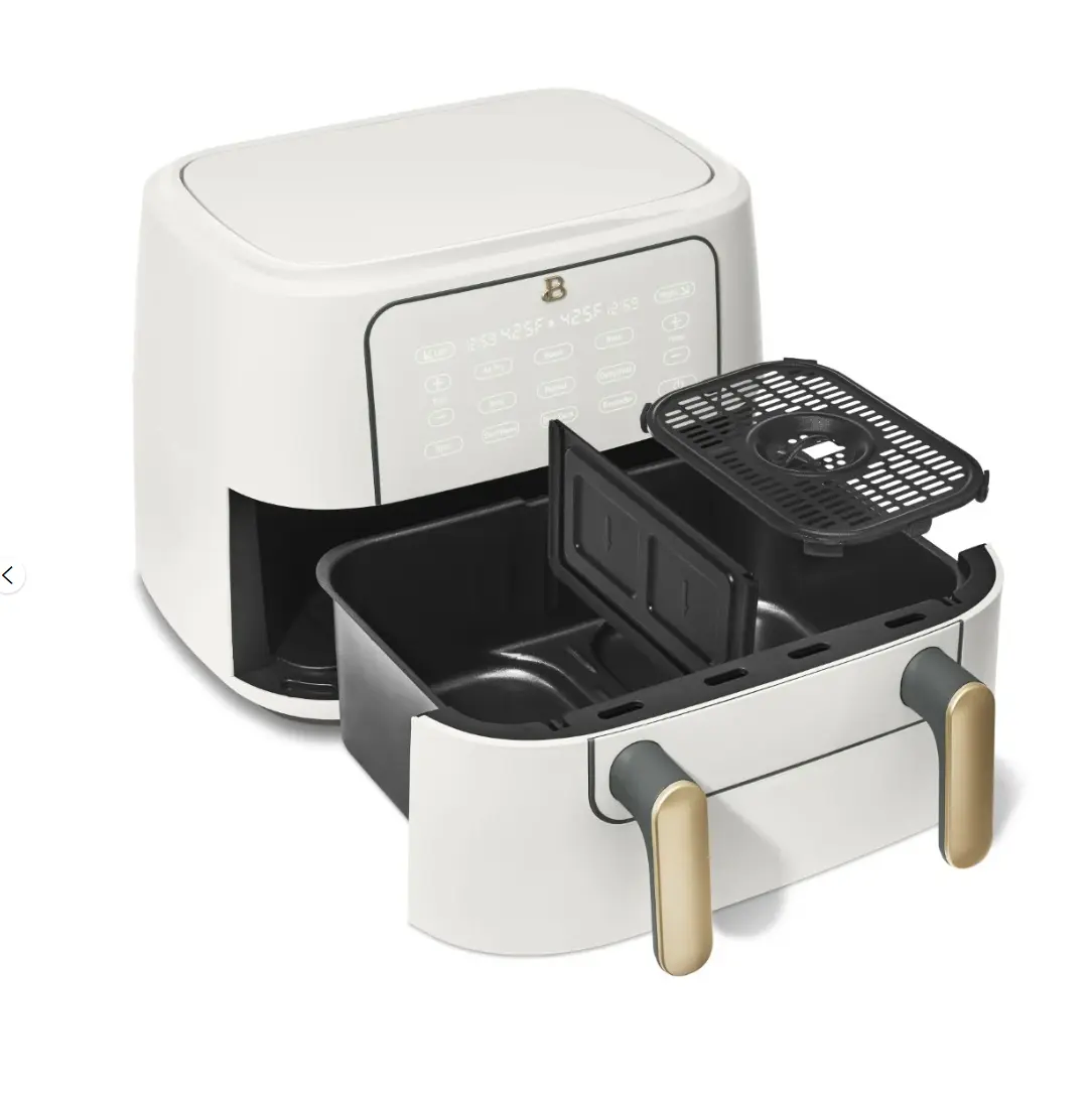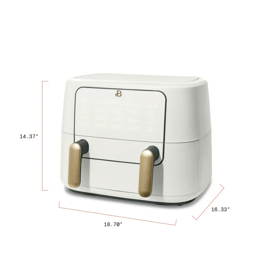 The most diverse Air Fryer on the market. The 9QT TriZone Air Fryer lets you cook 2 foods, 2 ways at the same time using separated baskets or 1 larger meal using the full basket by removing the center divider. For foods needing different cooking times, program each items accordingly to finish cooking at the same time. Air fry, roast, reheat, dehydrate, bake or broil your favorite meals with the 9qt TriZone Air Fryer with Touch-Activated Display.
