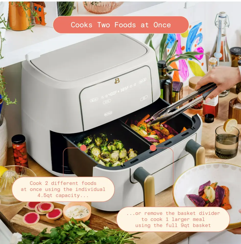 ·Cook 2 different foods at once using the individual 4.5qt capacity cooking zones or remove the basket divider to cook 1 larger meal using the full 9qt basket