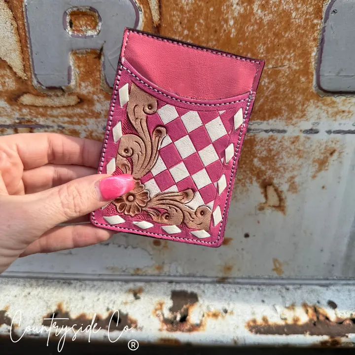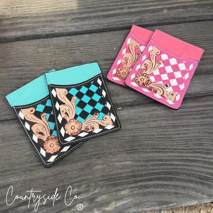Belle Checkered Tooled Leather Credit Card Holder Details:
