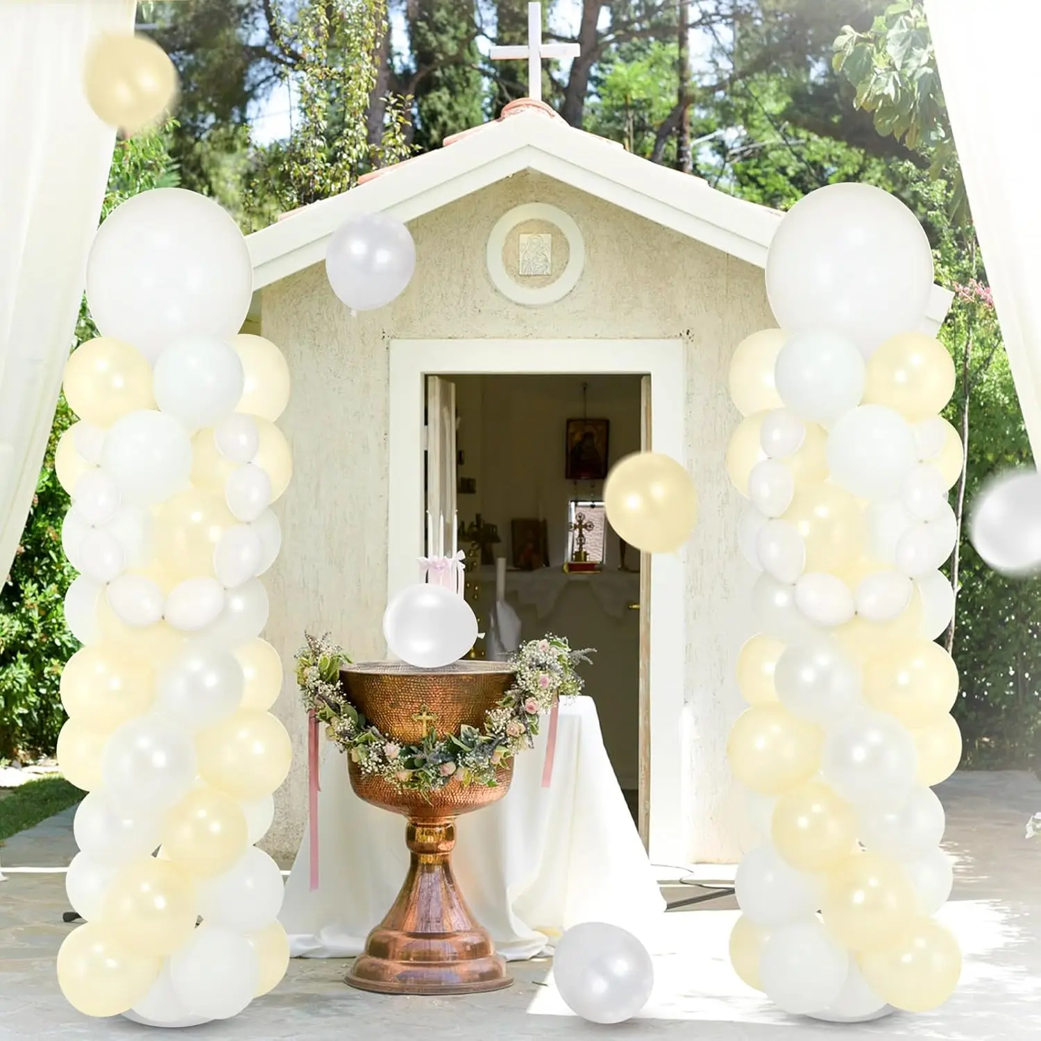 Create a clean and elegant party setup with pearl white balloons and adjustable column stands designed for stylish event decorations.
