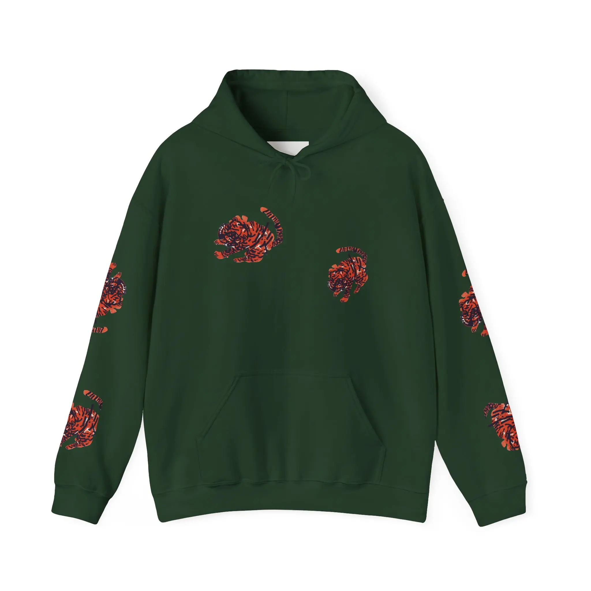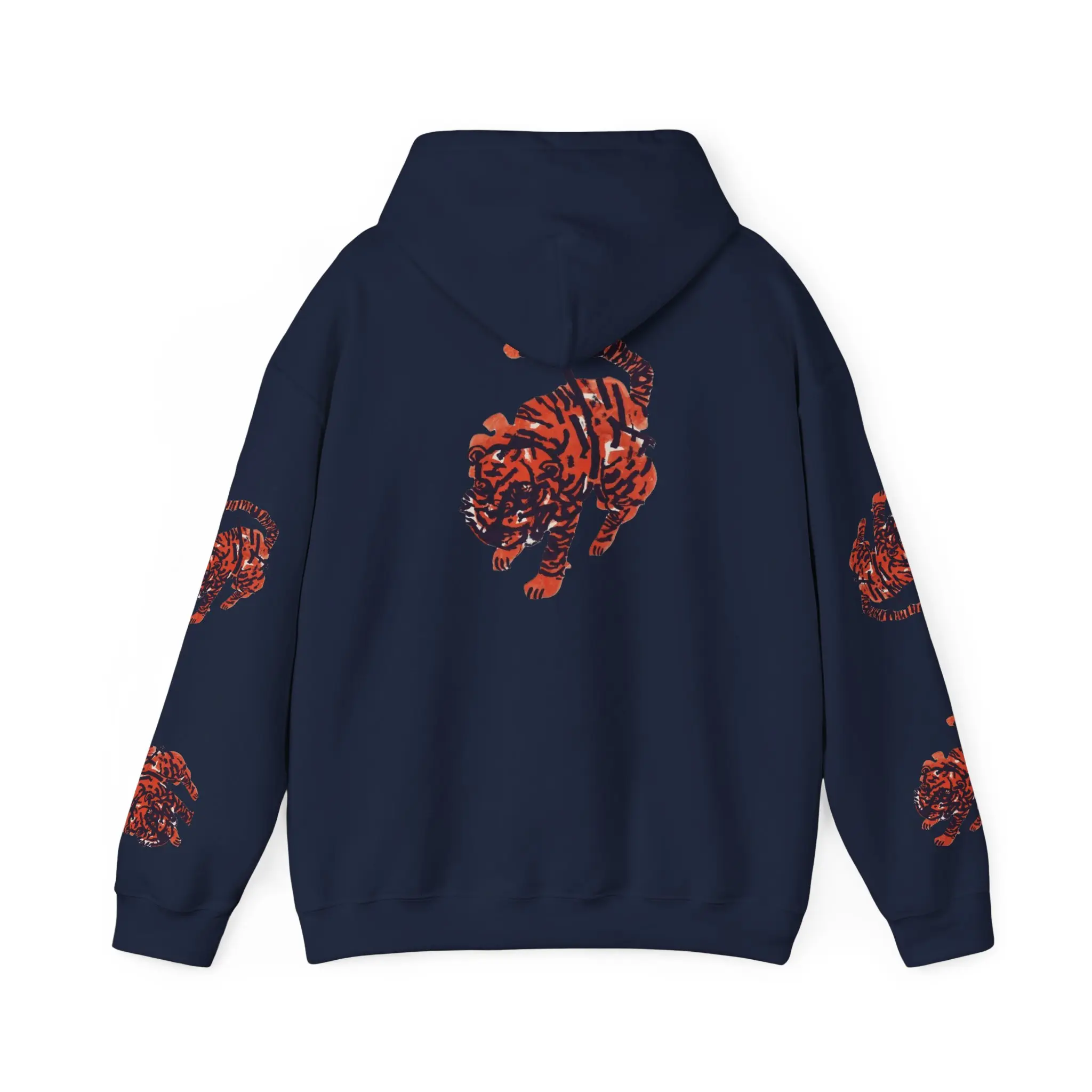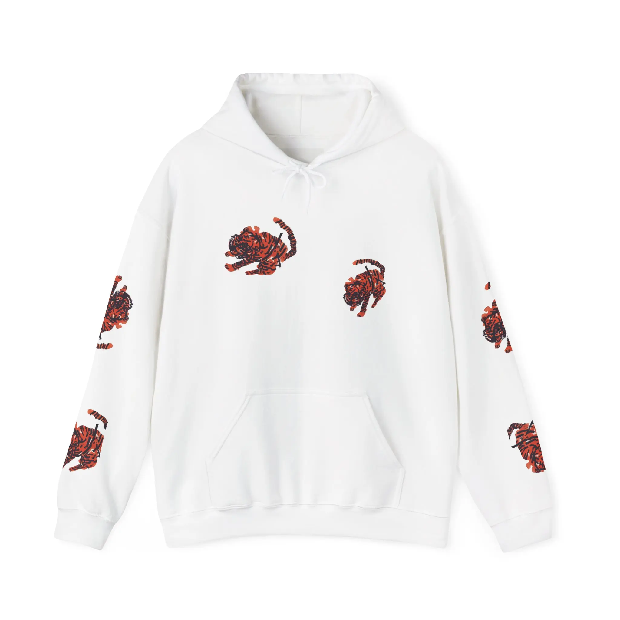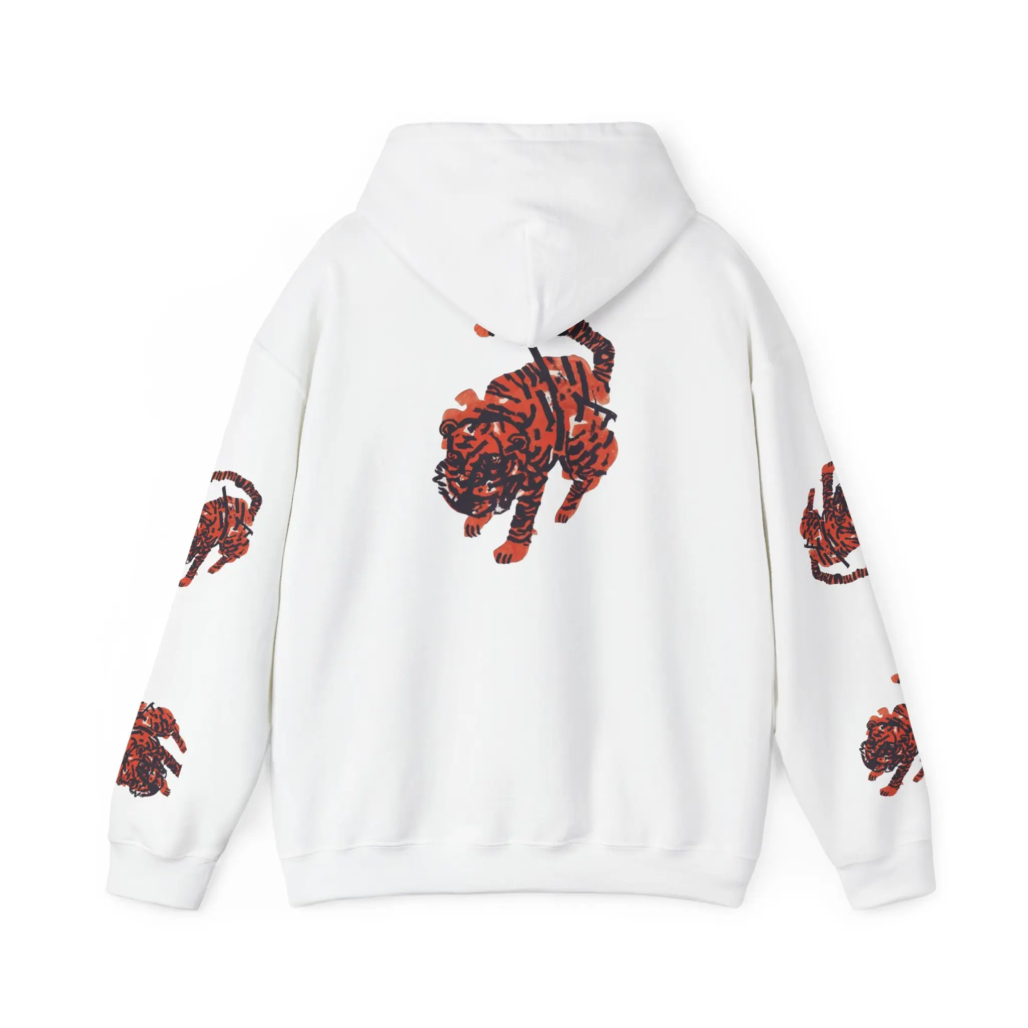 This soft, medium-heavy hoodie brings bold, hand-drawn tiger motifs to a clean white canvas. The slightly oversized classic fit and double-lined hood create a cozy, wearable silhouette while the repeated tiger prints across chest, back, and sleeves add movement and attitude. It’s the kind of sweatshirt you reach for when you want warmth without losing edge — whether you’re layering for a chilly walk through the city, hanging out with friends at a late-night show, or settling in with a sketchbook. Subtle details like the kangaroo pouch, color-matched drawcord, and tear-away label keep comfort front and center, and the sturdy cotton/poly blend holds prints vibrantly wash after wash.