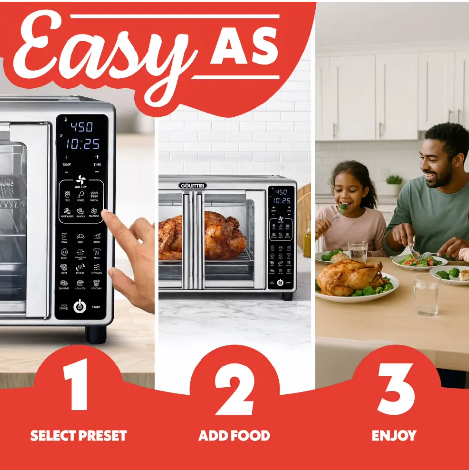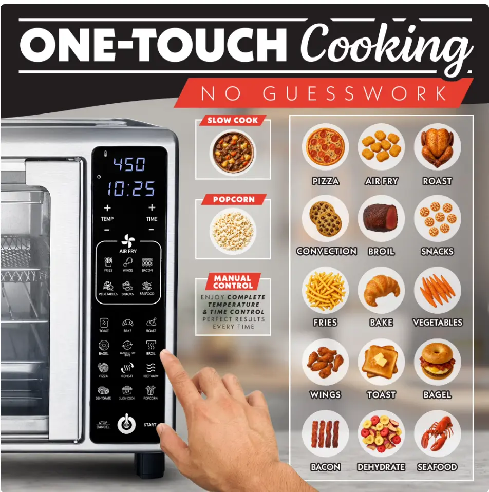 The 1700W 6-Slice Digital Toaster Oven Air Fryer uses advanced technology for great results. Its FryForce 360 Technology quickly circulates hot air, cooking food evenly for a crisp, golden finish. With 19 One-Touch Presets, you can easily cook a variety of dishes. The touchscreen lets you adjust time, temperature, and toast settings. A large window lets you see your food as it cooks, while easy-to-open French doors make it simple to use. It’s a great mix of style and efficiency.