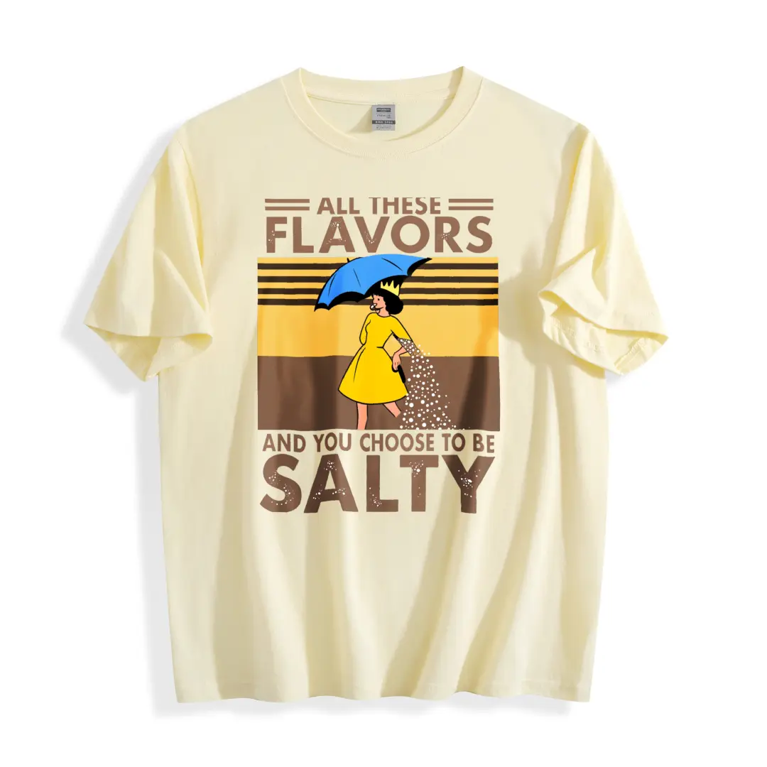 Retro Vintage Style Unisex T-Shirt With Woman Holding Umbrella And Text All These Flavors And You Choose To Be Salty Summer Casual Wear For Men Women And Teens Perfect Gift For Friends Family Or YourselfRetro Vintage Style Unisex T-Shirt With Woman Holding Umbrella And Text All These Flavors And You Choose To Be Salty Summer Casual Wear For Men Women And Teens Perfect Gift For Friends Family Or Yourself