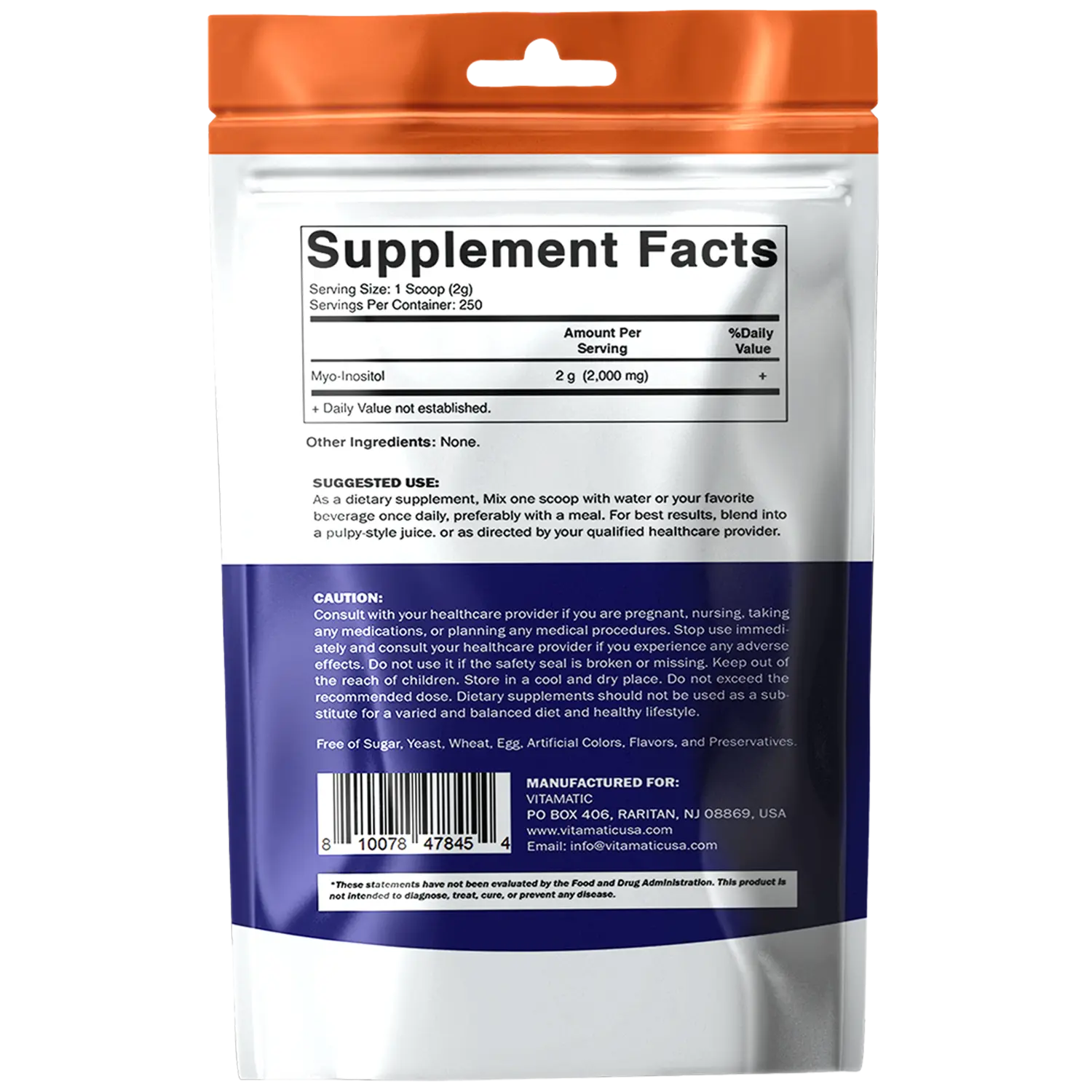 Vitamatic Myo-Inositol Powder 2000 mg per Serving | 500 g (250 Servings) | Pure Powder | No Sugar | No Fillers | Non-GMO | Dietary Supplement