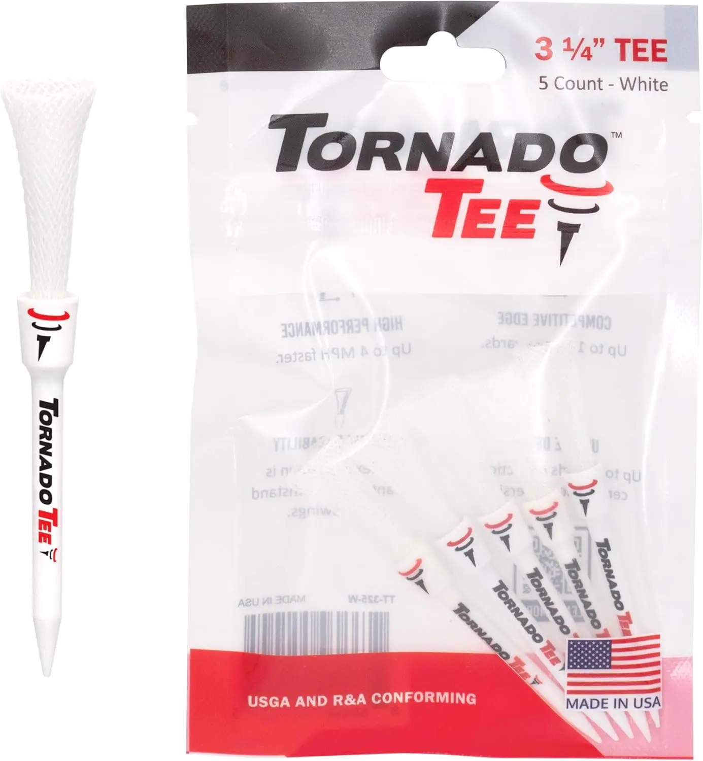 ·Tornado Tee is a revolutionary, high performance golf tee. USGA and R&A conforming. The patented flexible crown reduces spin and resistance, maximizing distance an decreasing dispersion. The Tornado Tee has the most effecient energy transfer from the clubhead to the ball compared to any other tee. The Tornado Tee is the #1 High Performance Tee for long drive professionals. Tornado Tee can be used by all players. Each pack contains 5 Tornado Tees. Standard length is 3.25 inches.