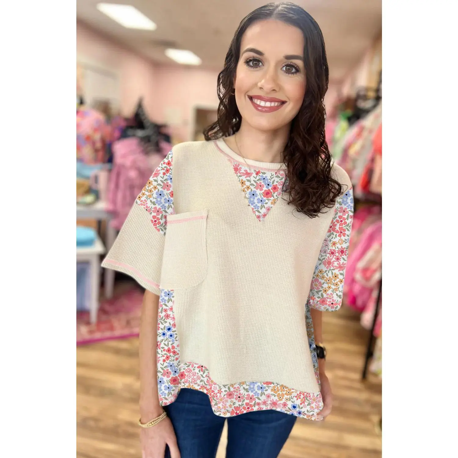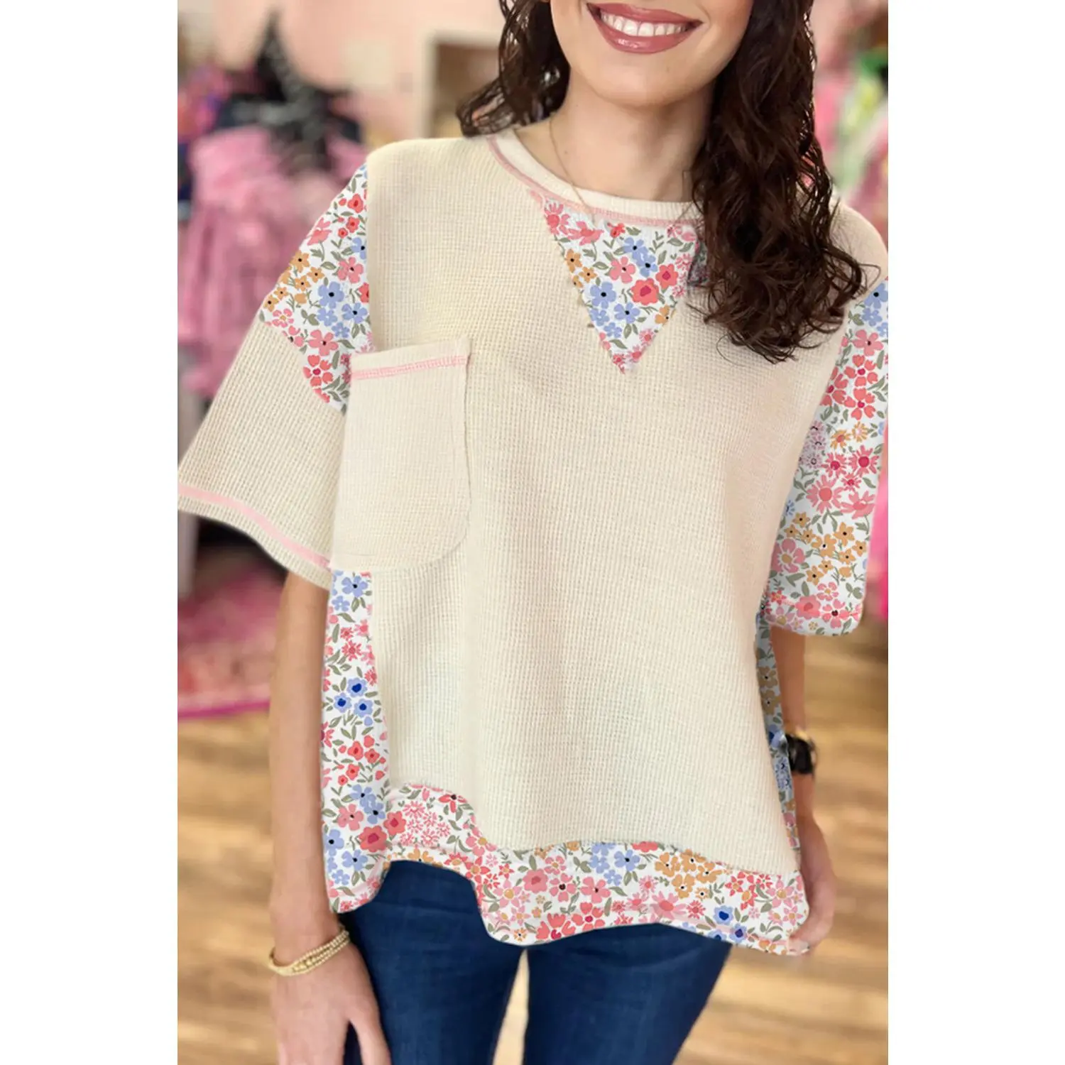 Beige Floral Patchwork Chest Pocket Wide Sleeve Waffle Top