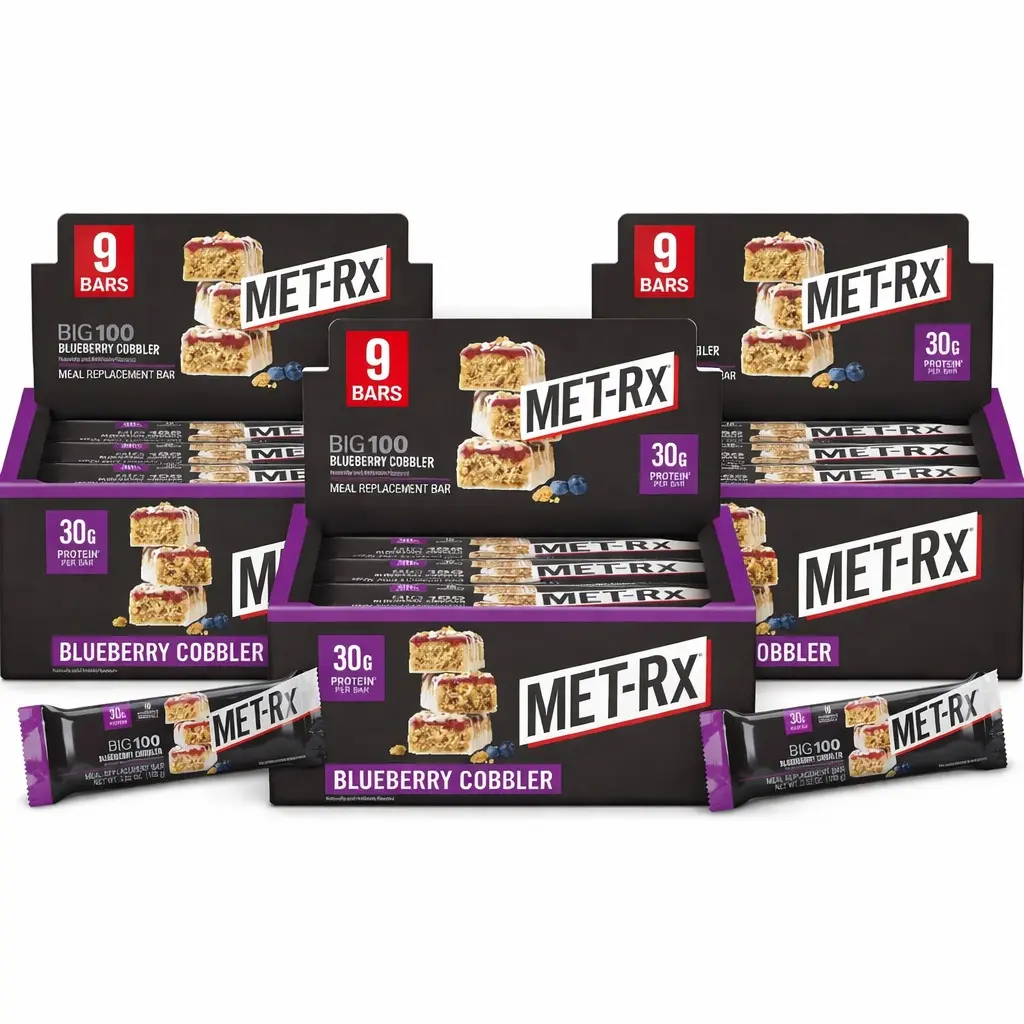 The Blue Berry Bundle includes three 9-count boxes of MET-Rx Big 100 Blueberry Cobbler bars, giving you 27 convenient meal replacement bars designed for busy days, workouts, and travel.