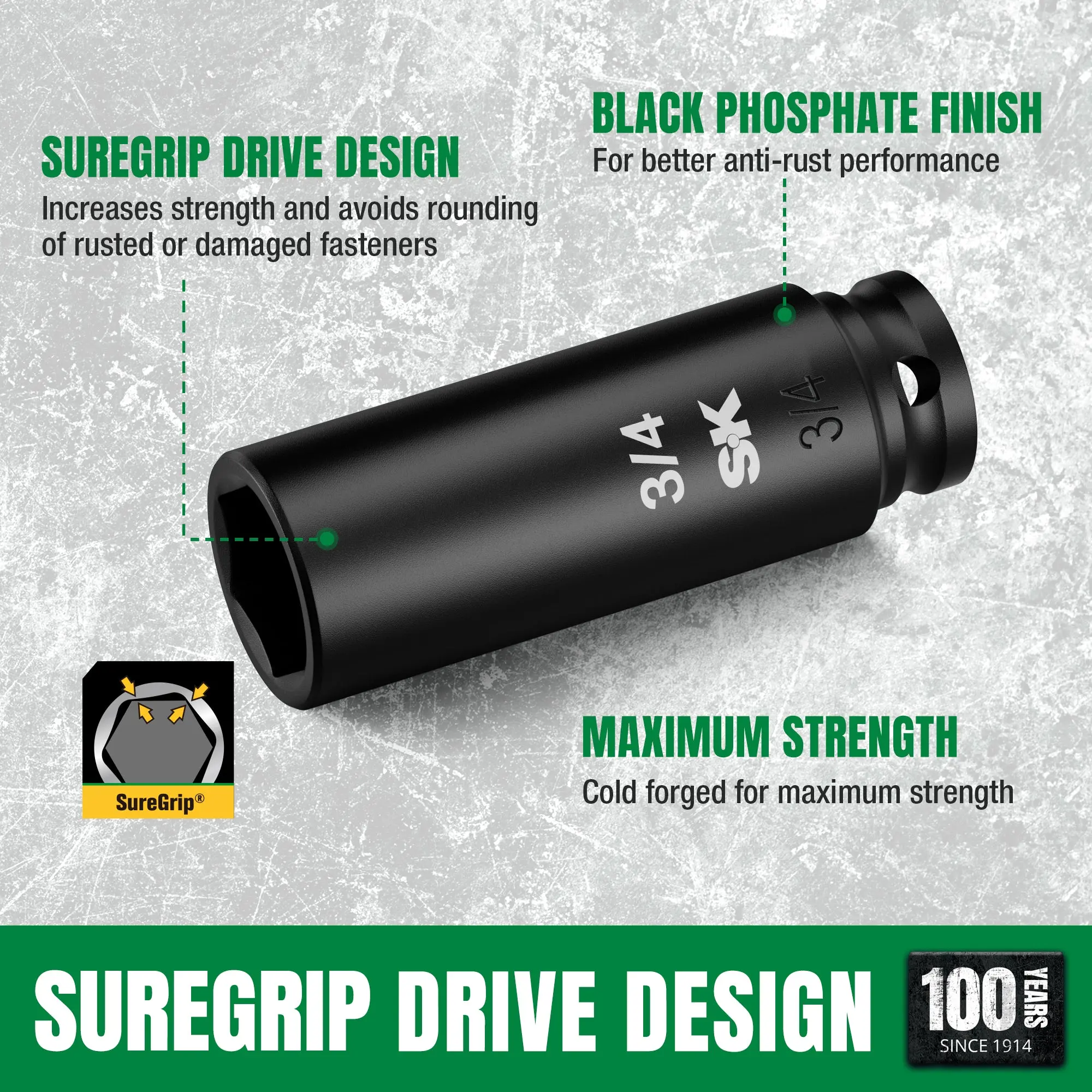 ·SureGrip® Drive Design: Drives the sides of fasteners—not the corners—to reduce rounding and improve torque on worn or rusted bolts