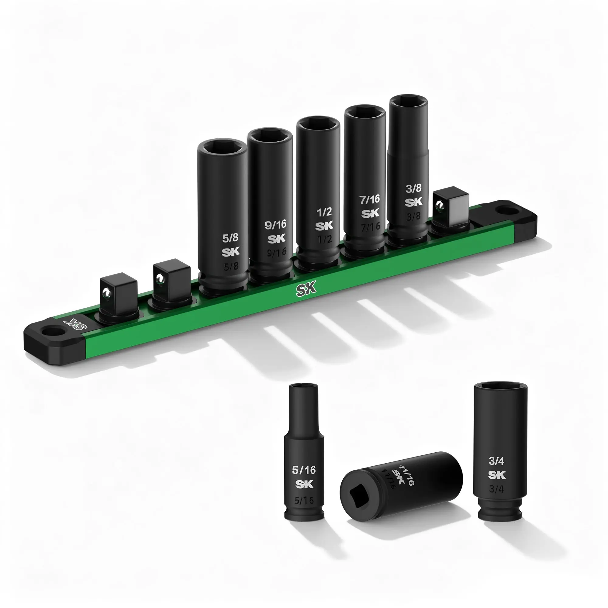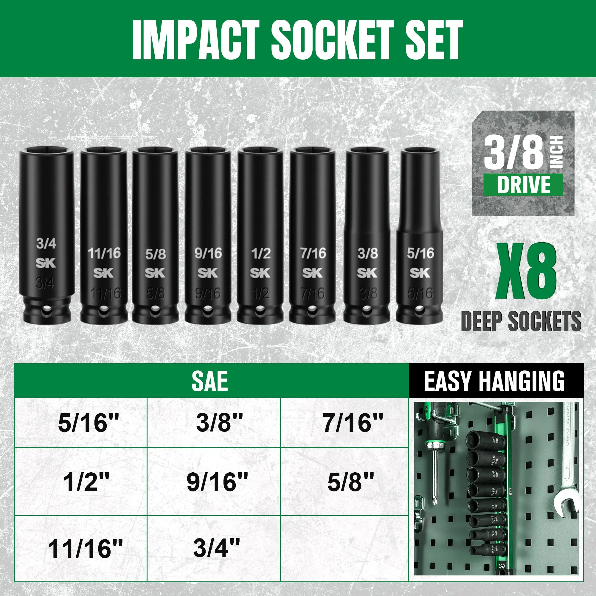 ·8-Piece 3/8" Drive Deep Impact Socket Set (SAE): Includes 5/16", 3/8", 7/16", 1/2", 9/16", 5/8", 11/16", and 3/4" sizes for a versatile range of applications