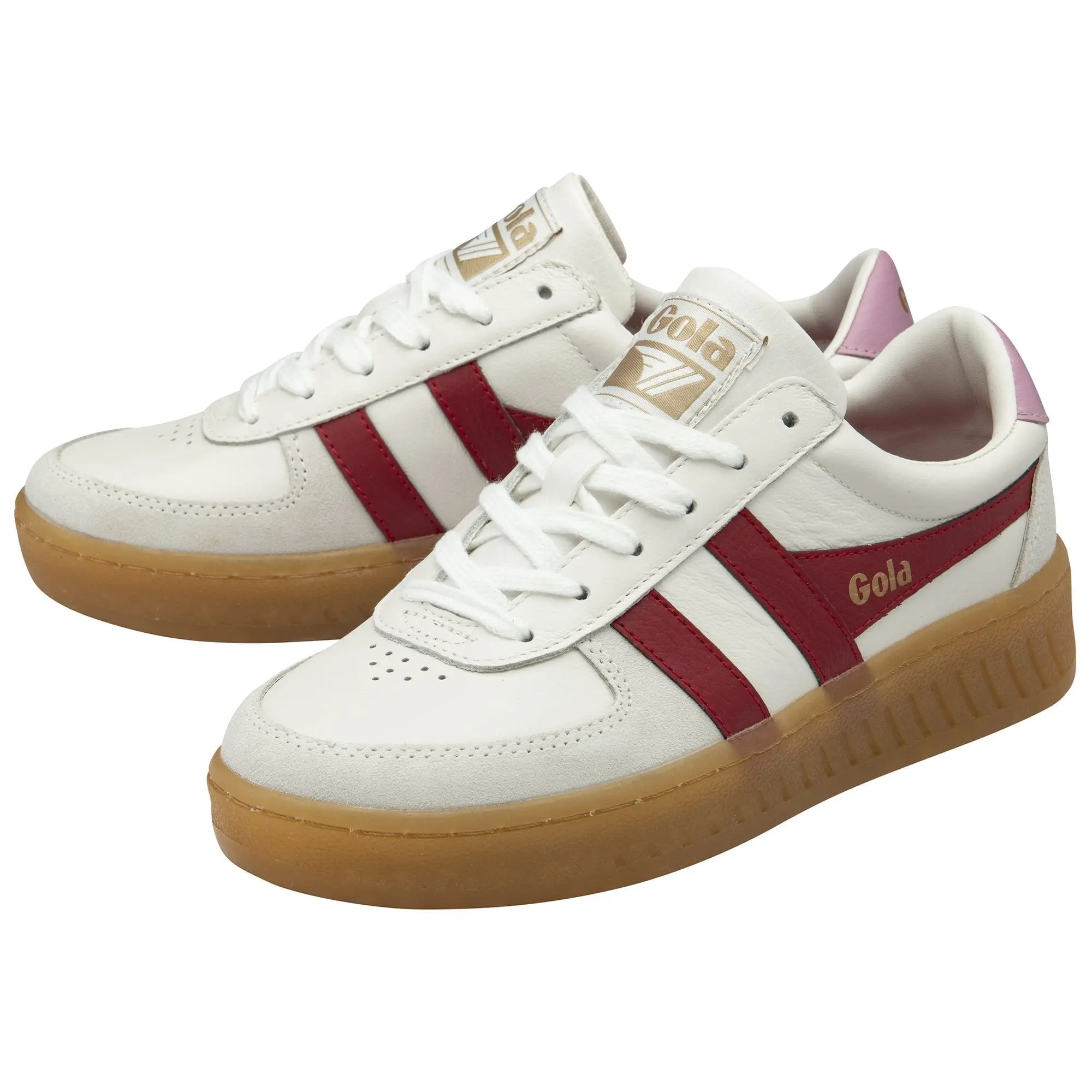 Gum soles are having a moment and Grandslam Elite takes the sneaker trending look up a notch. The much loved Grandslam vintage tennis upper is complemented with the perfect gum tone sole and a classic colour palette of white with deep red Gola wingflash branding. A candy pink heel pop adds a joyous twist to give a heritage women’s sneaker with a sunny disposition.