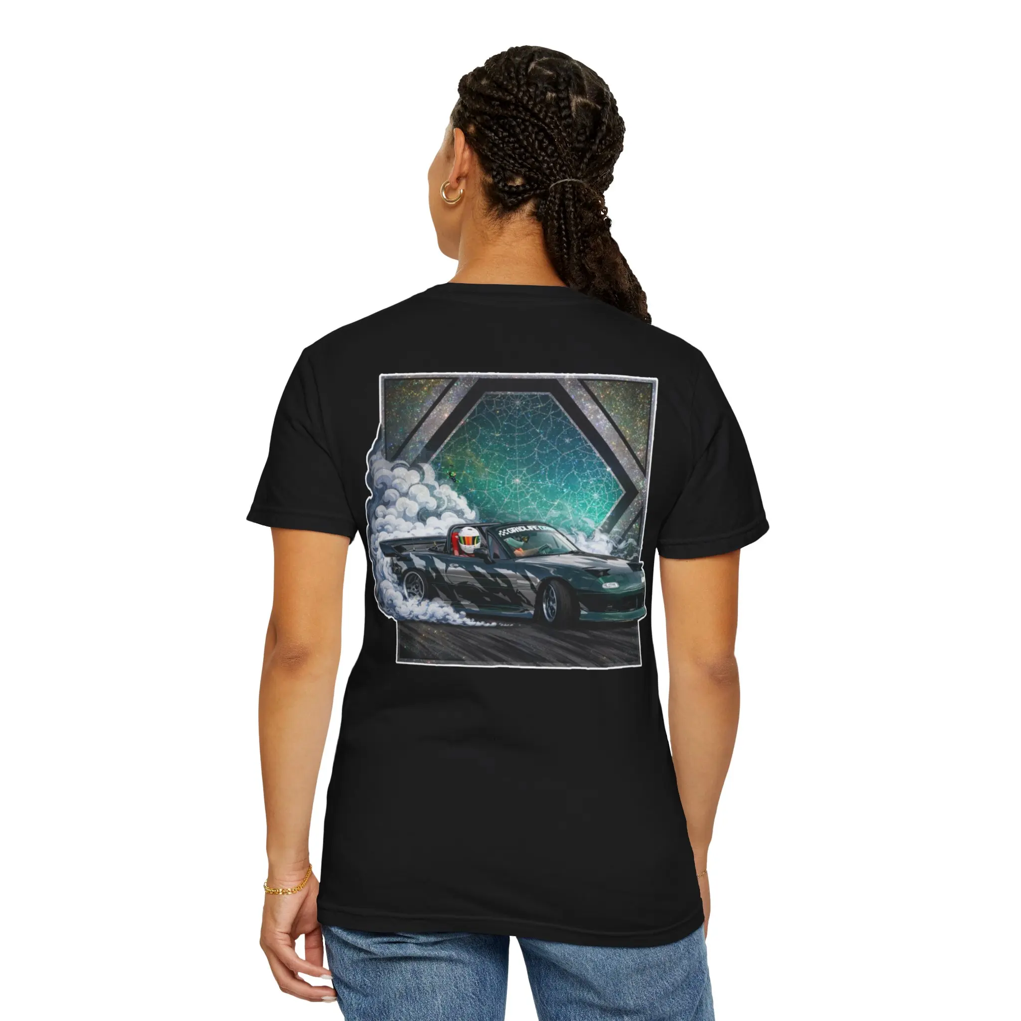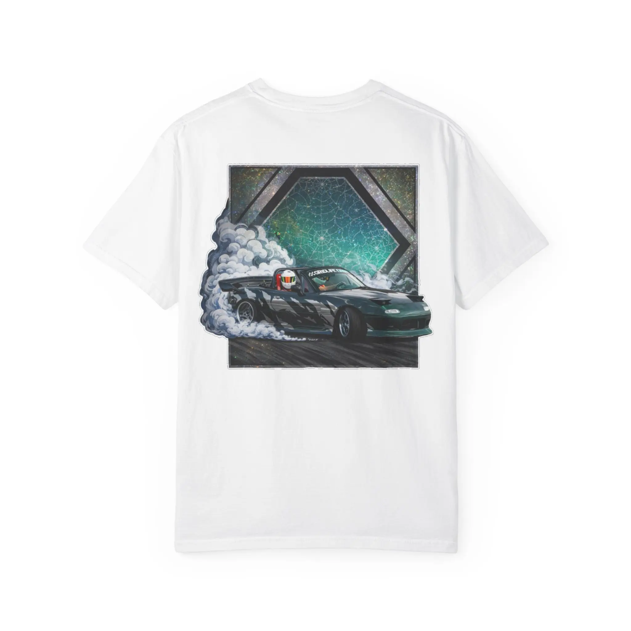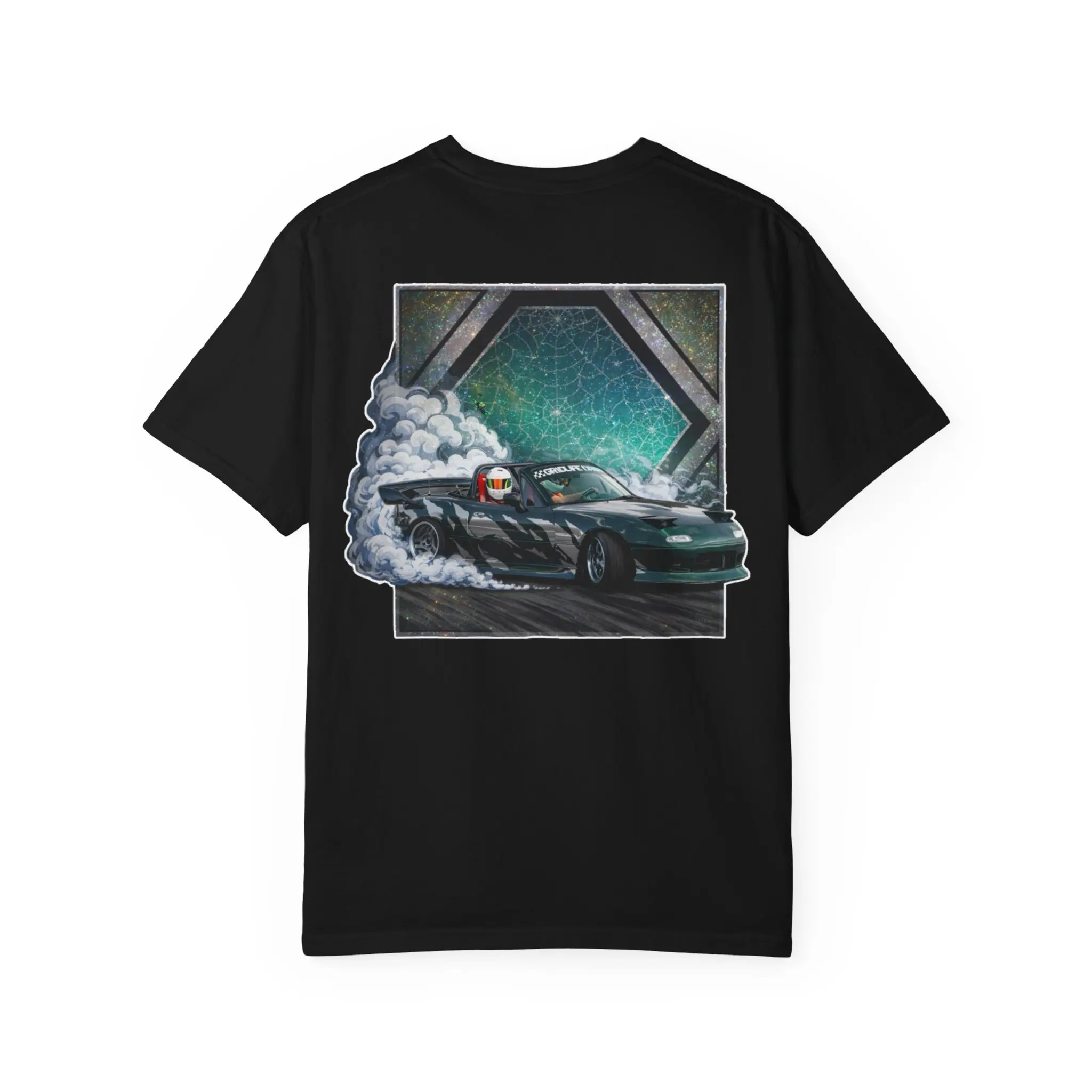 This heavyweight garment-dyed tee blends vintage softness with street-ready attitude. The relaxed, roomy cut and thick ring-spun cotton feel like a lived-in favorite from day one. On the front, a small chest emblem whispers motorhead energy; on the back, a bold illustration of a drifting car framed by a starlit window turns the shirt into a moving scene — equal parts late-night garage, racetrack adrenaline, and cosmic calm. Wear it to slow-dawn drives, meetups, or when you want clothing that reads like a story: comfortable, rugged, and quietly expressive.