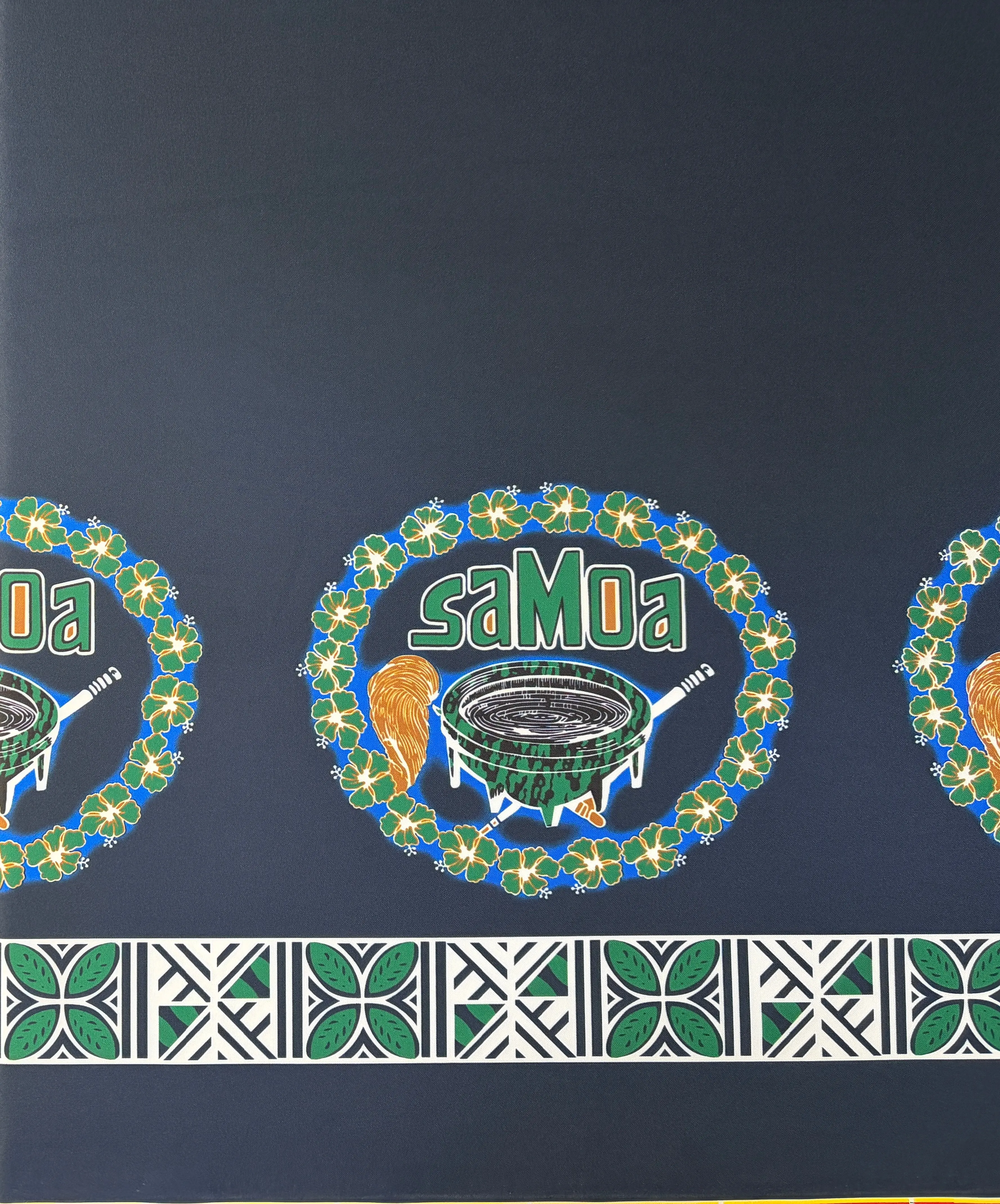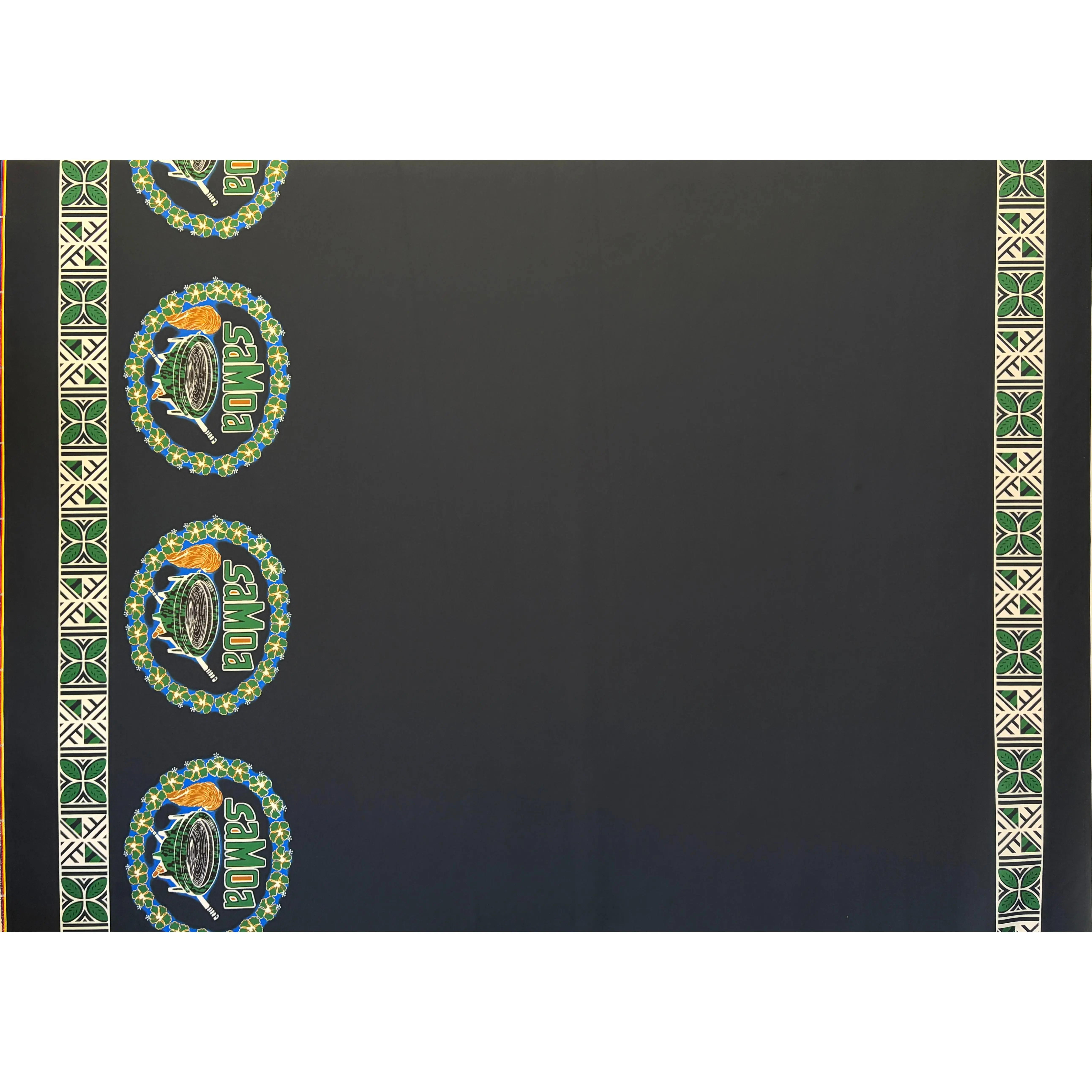 Celebrate Samoan culture with this stunning 59" wide polyester fabric featuring a vibrant hibiscus wreath design. The composition showcases the word "SAMOA" prominently displayed within an intricate kava bowl centerpiece, symbolizing tradition and island heritage. Framed by an elegant tapa double border, this fabric combines authentic Polynesian artistry with modern versatility. Perfect for quilting, home décor, apparel, and craft projects, the durable polyester construction ensures lasting color and quality. Bring the spirit of the Pacific islands into your creative endeavors with this culturally inspired textile.