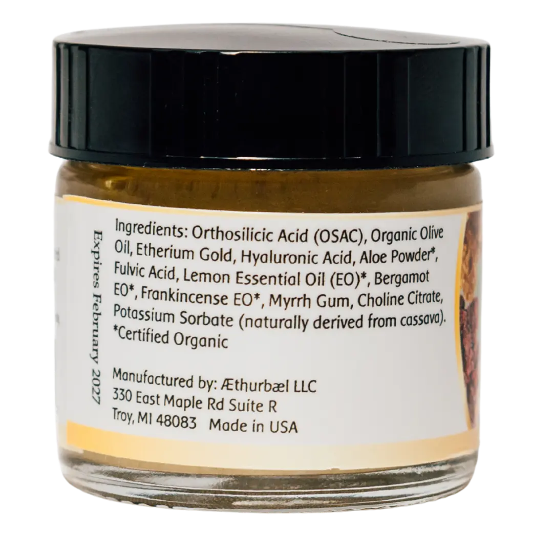 Orthosilicic Acid (OSAC), Organic Olive Oil, Meteoric Gold, Orbitally Rearranged Monoatomic Elements, Hyaluronic Acid, Organic Aloe Powder, Organic Fulvic Acid, Organic Lemon Oil, Bergamot Oil, Organic Frankincense Oil, Myrrh Gum, Choline Citrate, Potassium Sorbate (naturally derived from cassava).