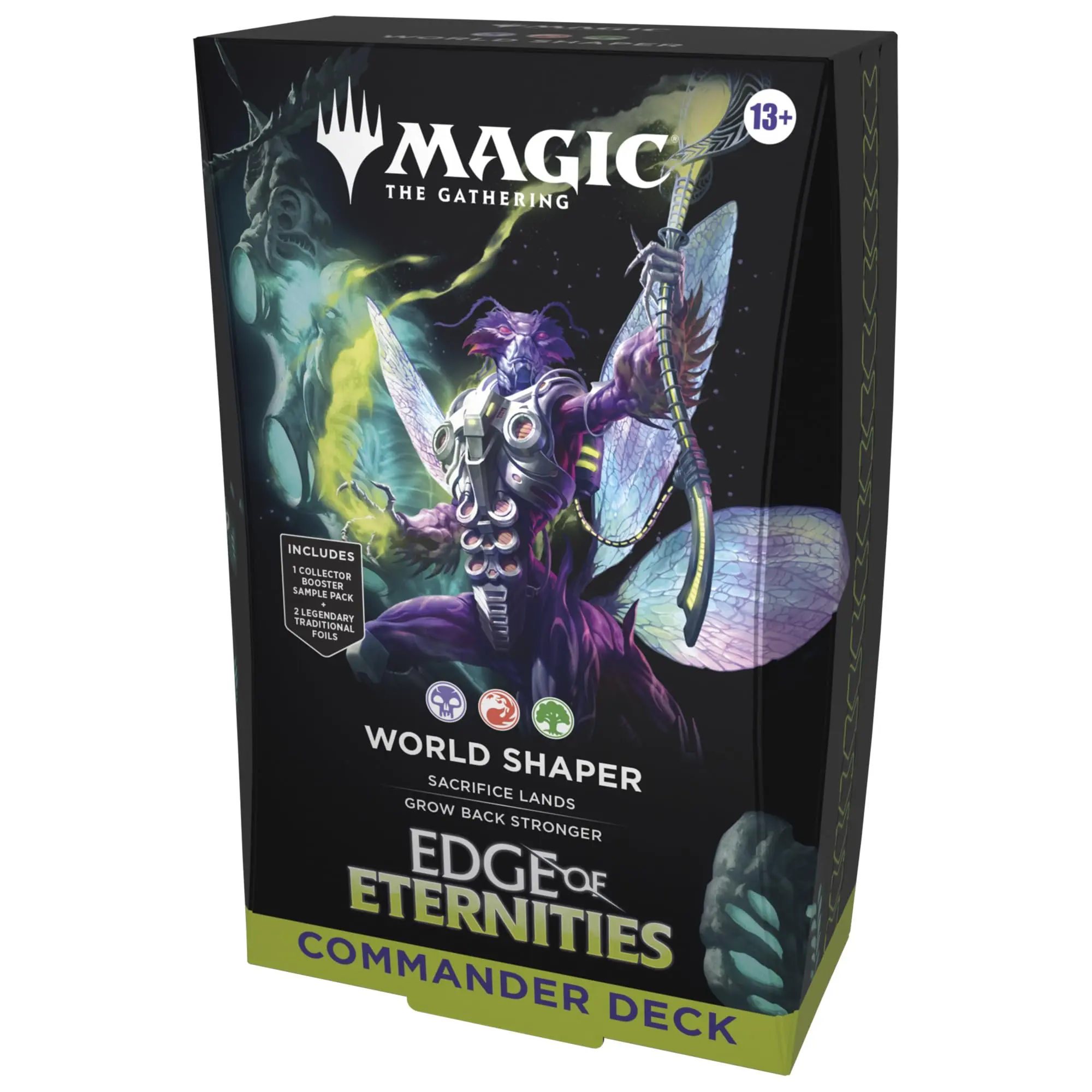 ·CONTENTS—1 ready-to-play World Shaper Edge of Eternities MTG Commander Deck (100 cards), a 2-card Collector Booster Sample Pack, 6 double-sided token cards, 4 punchout counters, and 1 deck box