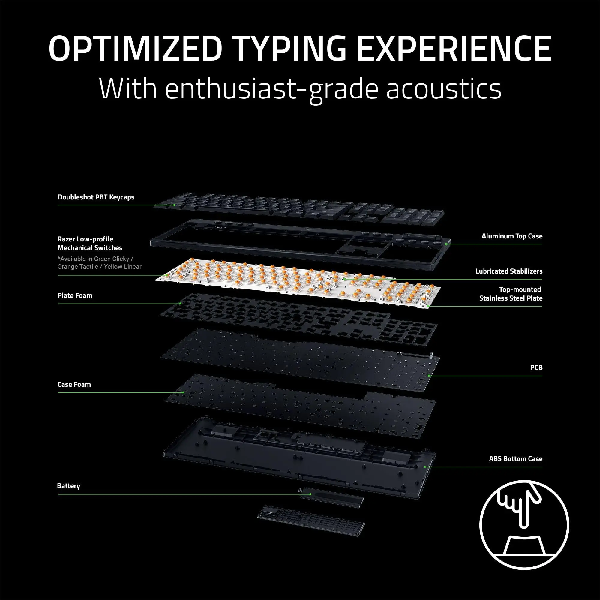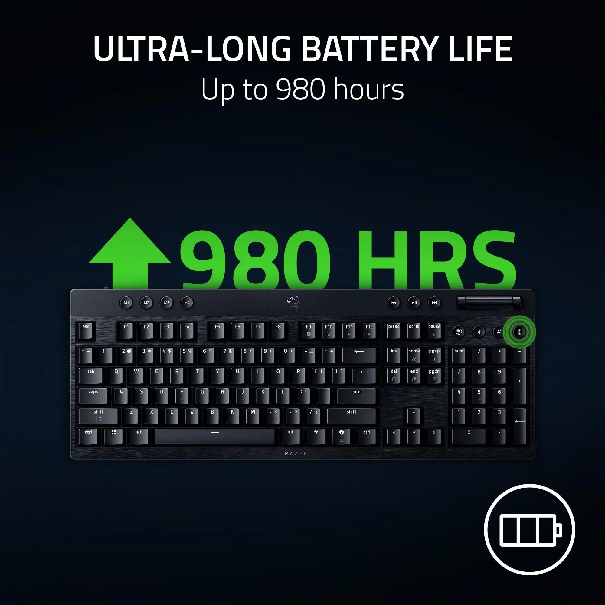 Details: Achieve maximum battlestation impact while retaining a minimum silhouette. Meet the Razer BlackWidow V4 Low-profile HyperSpeed—a wireless, ultra-slim gaming keyboard that's the full package. Choose between 3 low-profile switches that offer their own distinct feel. Go clicky with Green, get tactile with Orange, or keep it silent with Yellow. Game lag-free with our ultra-fast 2.4 GHz wireless and you can even pair a compatible Razer mouse to the same dongle via multi-device support. Attain higher levels of multi-tasking efficiency by toggling between 3 Bluetooth devices, and streamline your control with a clickable roller, dedicated media & connectivity buttons to manage music, devices and AI prompts, plus 4 specialized macro buttons to optimize gameplay. The ultra-low 18.5 mm front height provided an unparalleled strain-free typing and gaming experience for hours and hours and the keyboard is complete decked out with a solid aluminum ally top case for additional durability and a premium feel. Despite the low-profile nature, lubricated stabilizers in conjunction with dual-sound dampening foams offer clean keystrokes for an enhanced typing sound and feel. This is topped off with textured doubleshot PBT keycaps which are tougher and more durable than ABS, enabling it to maintain its pristine finish with optimized legends to promote greater backlight illumination no less. Finally, game up to 980 hours on a single charge with Power Saving Mode, easily accessible via a dedicated shortcut.