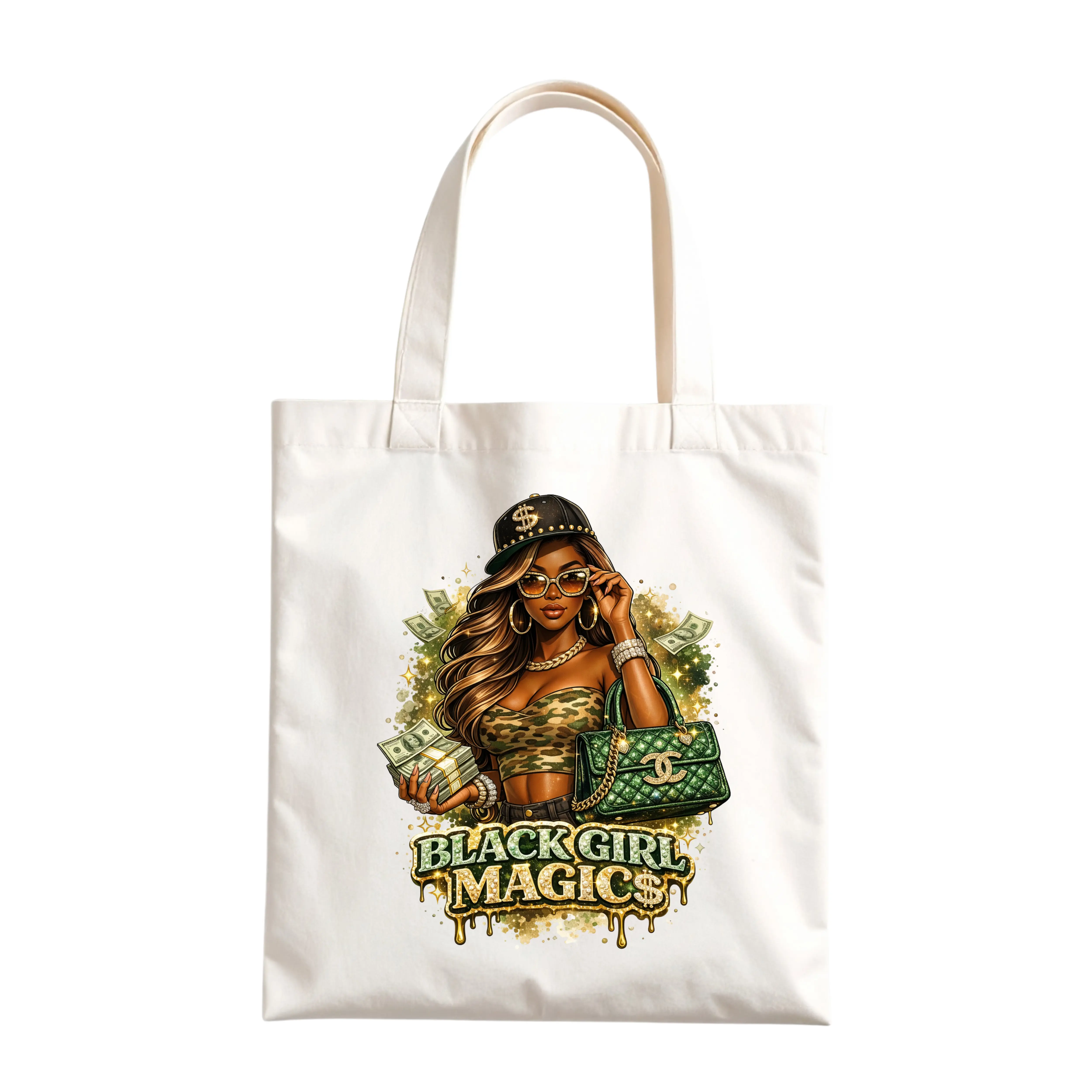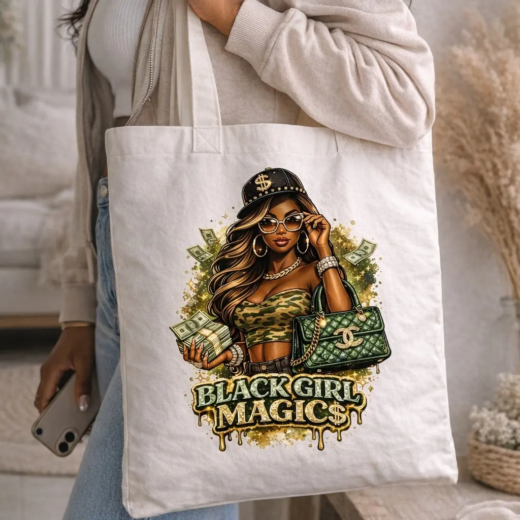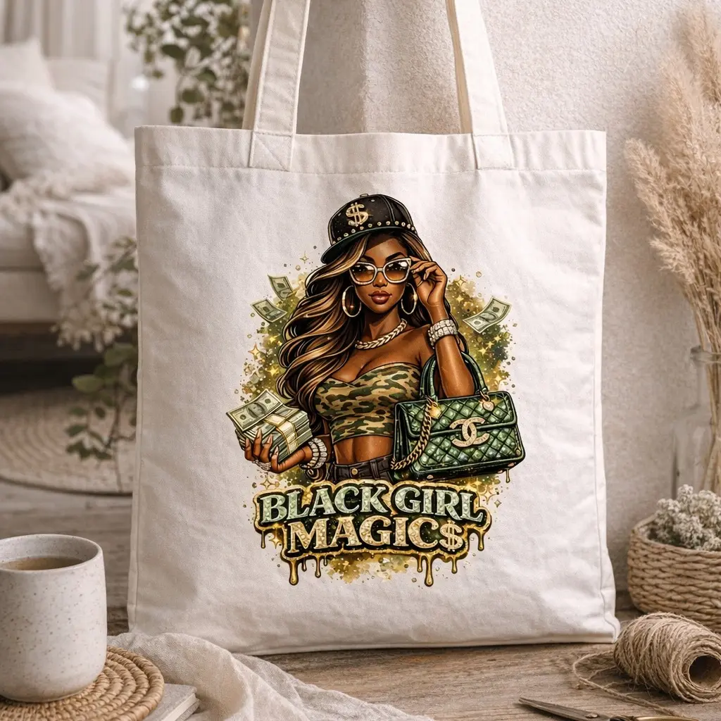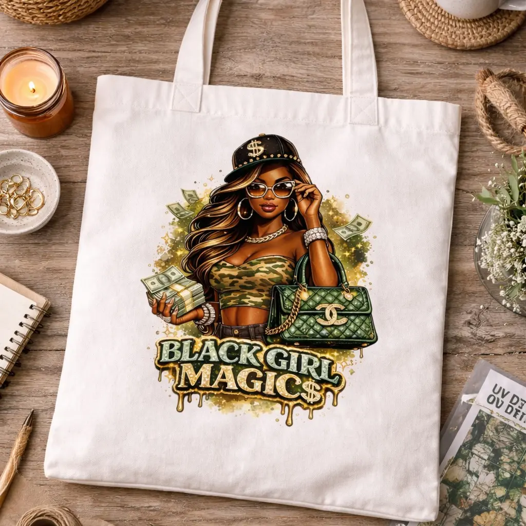 Celebrate your power and pride with this bold Black Girl Magic tote bag. Crafted from durable canvas, it's perfect for everyday carry. Whether you're heading to work, school, or out with friends. The striking design makes a confident statement while the spacious interior keeps your essentials organized. Comfortable handles and quality construction mean this bag is built to last. A meaningful accessory that honors strength, beauty, and resilience.