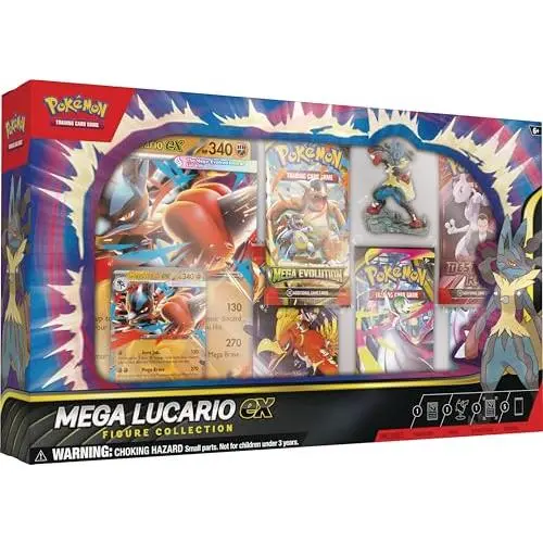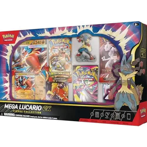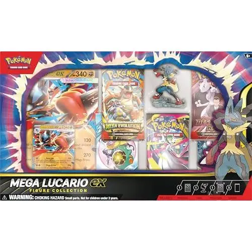 ·The Pokémon TCG: Mega Lucario ex Figure Collection includes 1 etched foil promo card featuring Mega Lucario ex and 1 oversize promo card featuring Mega Lucario ex.